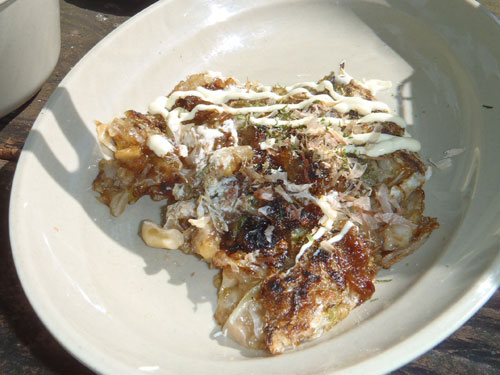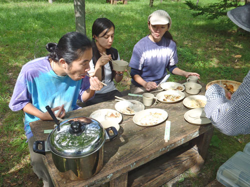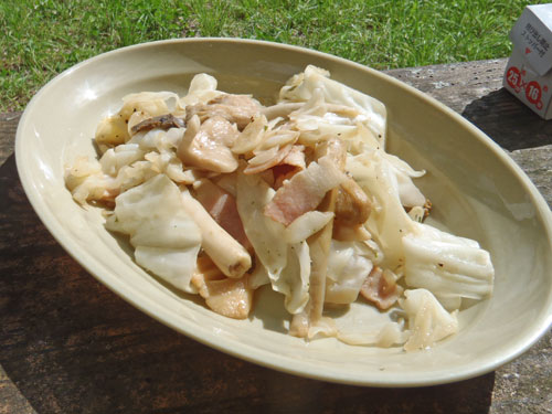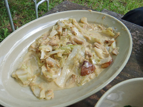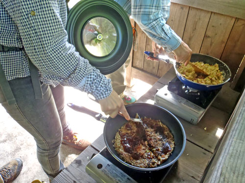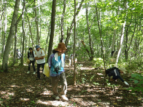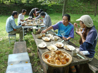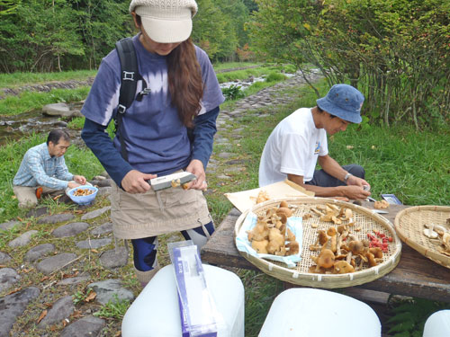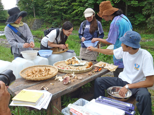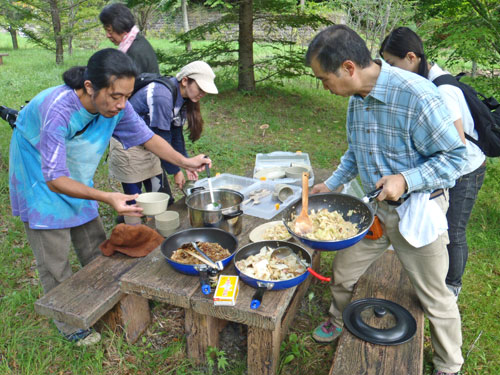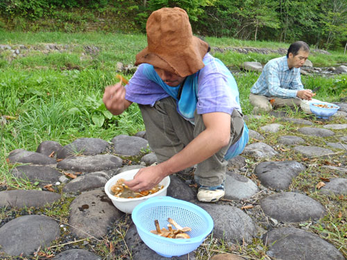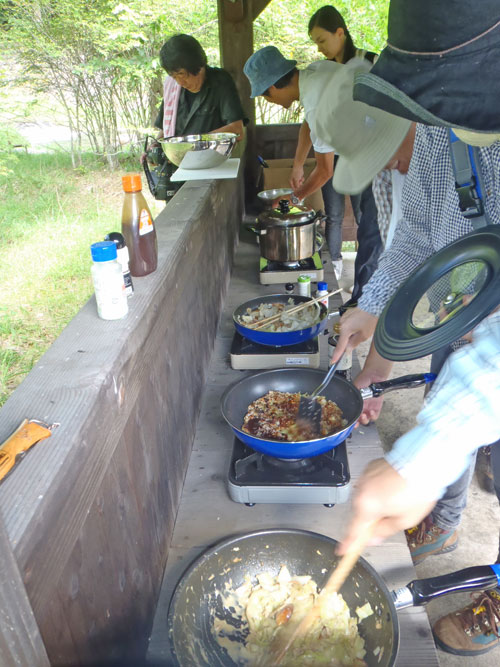今回は参加者6名様と上毛新聞社グラフぐんまの取材が入り、私を含めて9名で山に入りました。このぐらいの人数がちょうど良いです。今日の野生きのこ料理は、以下の通り。 1. 野生きのことキャベツのベーコンバター醤油炒め 2. 野生きのことキャベツのツナマヨネーズ炒め 3. 野生きのことキャベツのお好み焼き 4. 野生きのこと鶏ササミのお吸い物