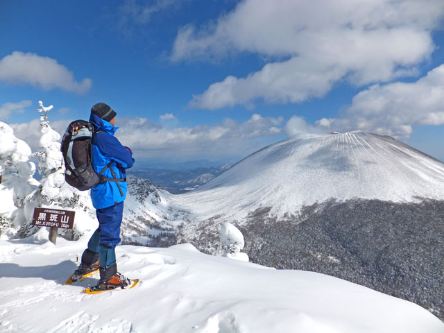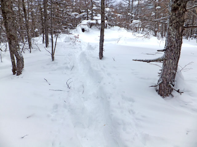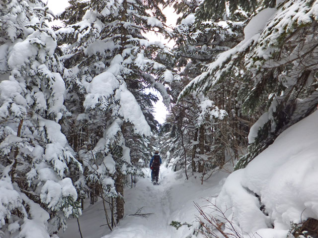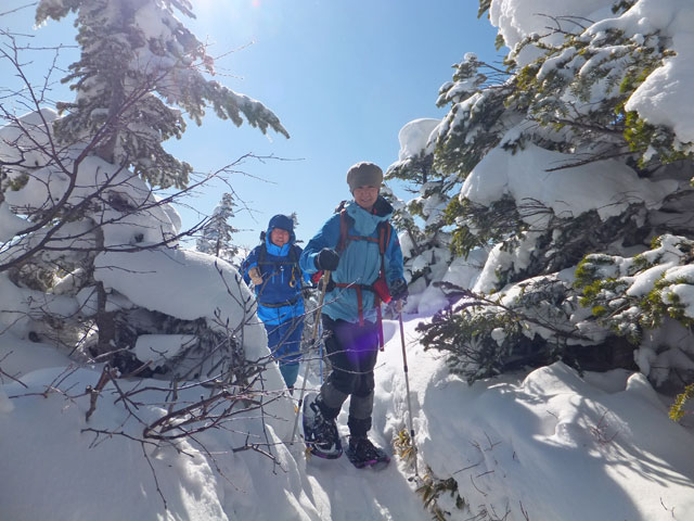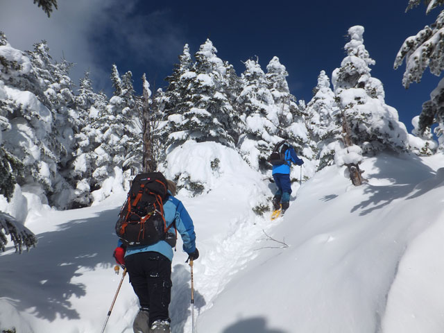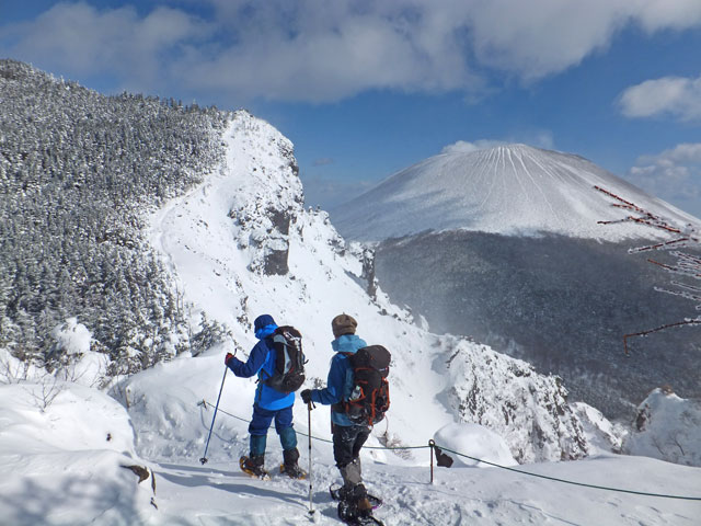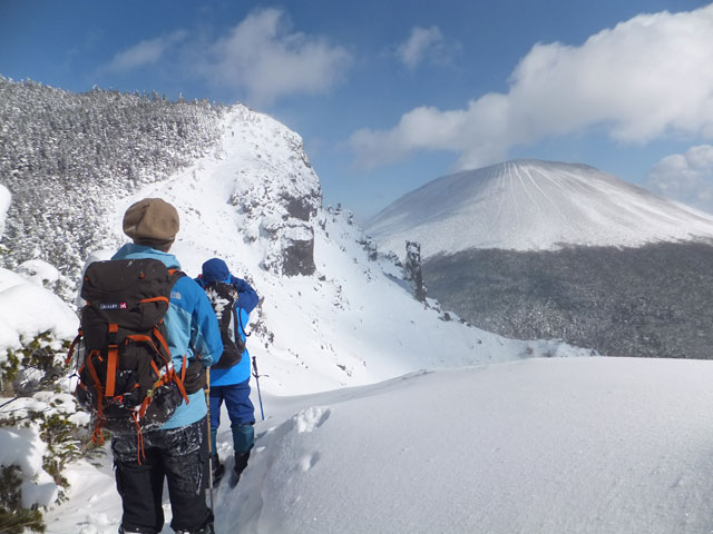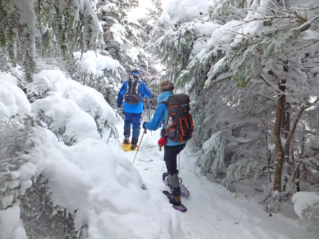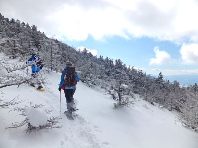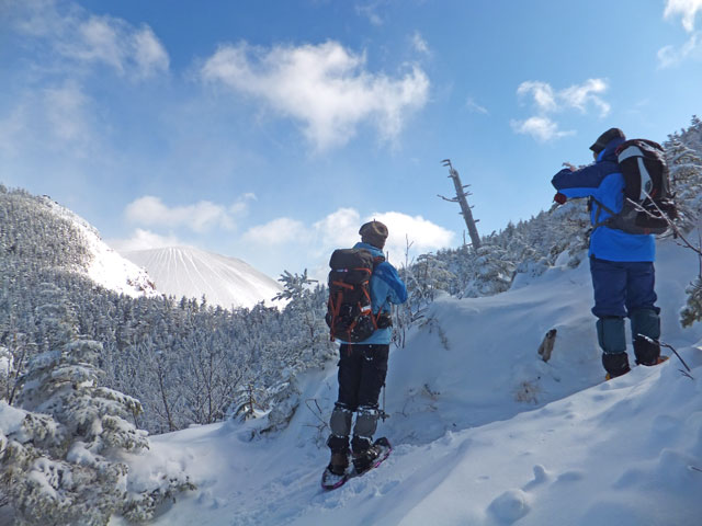 午前9:30頃、すでに何人かの登山客が準備をしていました。このパーティーはスノーシューでは無くアイゼンを使用していました。登山道を歩き始めると納得。アイゼンで登る方が多いらしく、踏み跡は幅が狭く、スノーシューだと歩きにくい状態でした。さすがは冬山登山人気の山です。