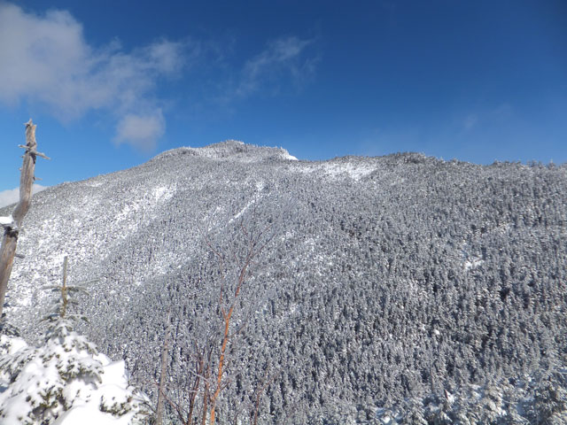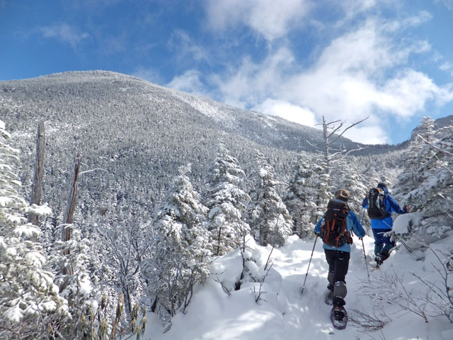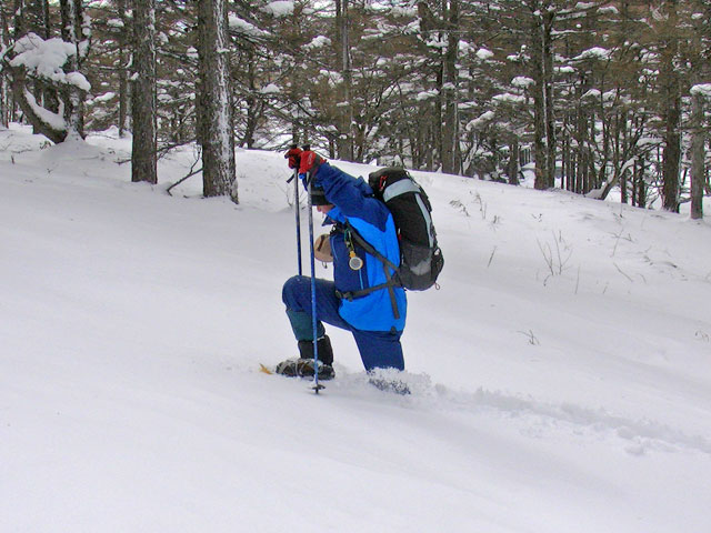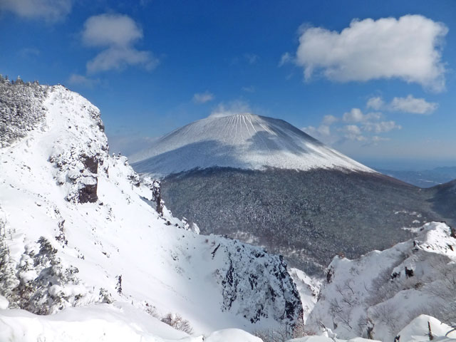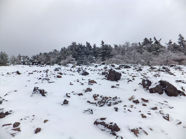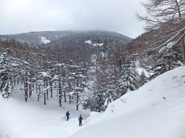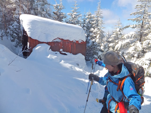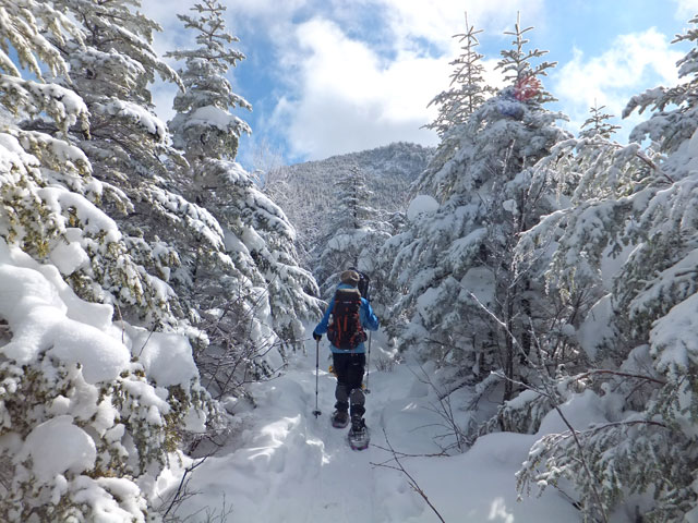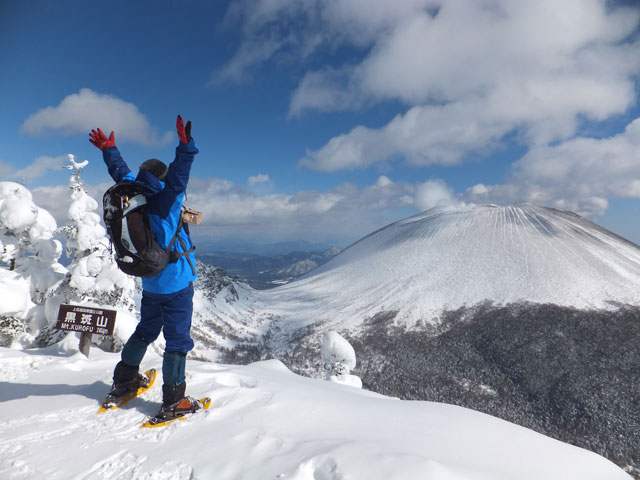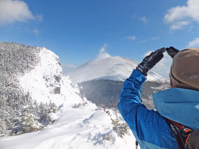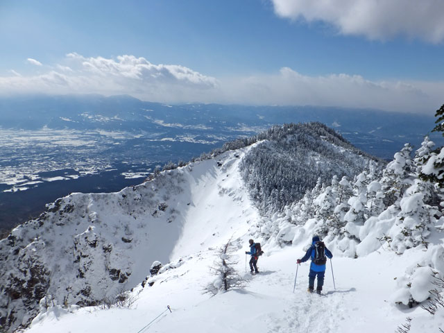 午前9:30頃、すでに何人かの登山客が準備をしていました。このパーティーはスノーシューでは無くアイゼンを使用していました。登山道を歩き始めると納得。アイゼンで登る方が多いらしく、踏み跡は幅が狭く、スノーシューだと歩きにくい状態でした。さすがは冬山登山人気の山です。