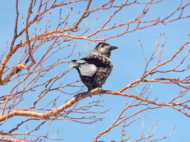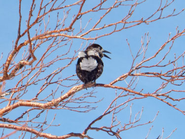 かなり近いです。10 m 位。あんまりうるさいので私も真似してみることにしました。「ガーガーガー」ホシガラス君も変なのが来たな…? と思ってこっちを見ています。こんなことを何度か繰り返しましたが…ホシガラス君の方が、愛想を尽かして行ってしまいました〜
