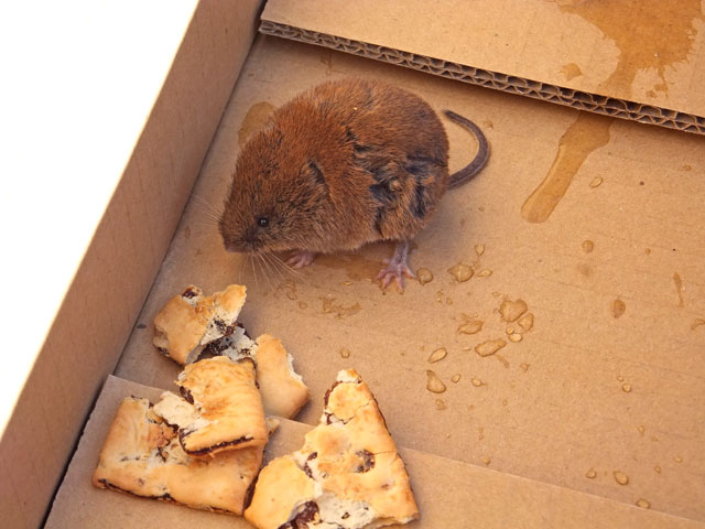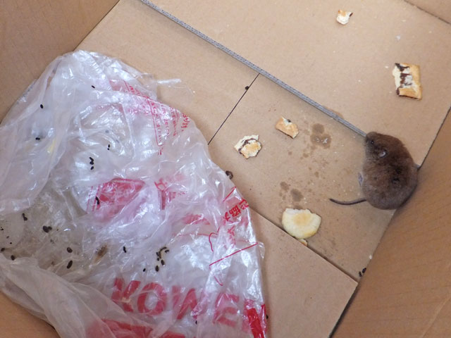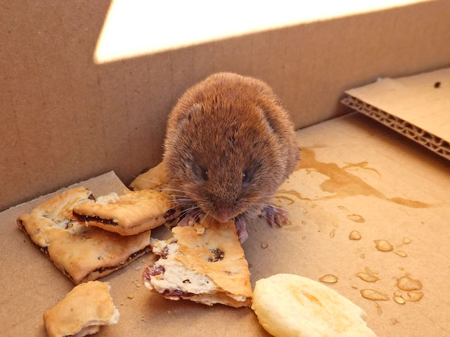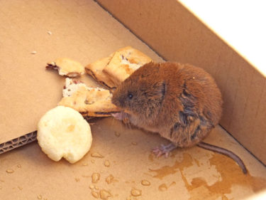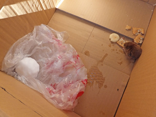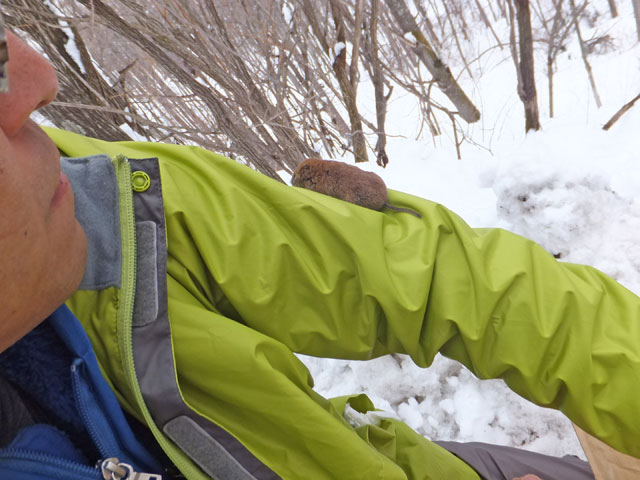 スノーシューイベントの往路で、万座ハイウェーに出てきたハタネズミちゃん。弱っていてちょっと心配だったので、食べ物を与えることにしました。イベント実施から帰ってくると、クッキーを結構食べいてて、いっぱいウンチもしていて安心しました。懐いて困りましたが、最後は森に帰っていきました。
