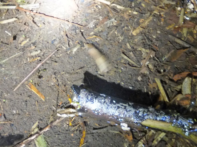 夜のバラギ湖を下見中。小川の中を覗くと、小さな枝が動いています。これはトビケラの幼虫です。川の中に住むヤドカリの様な生き物。落ち葉などを切って筒状に組み上げた可携巣を背負っています。神秘的な生き物が活動してくれていました。