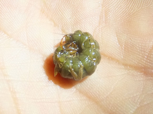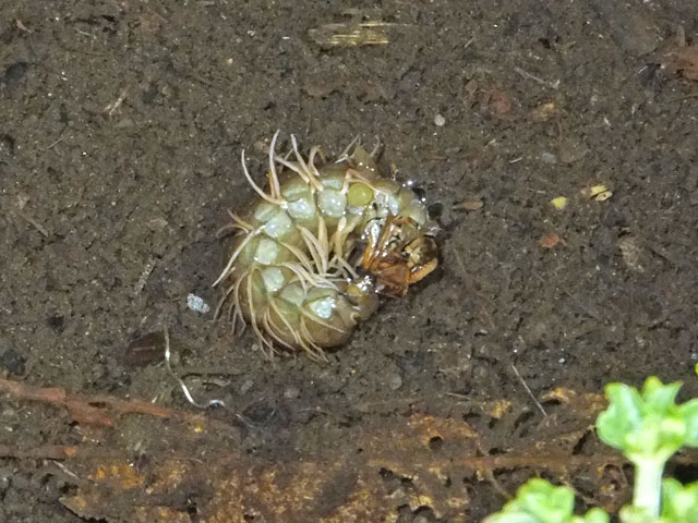 よく見ようと、水中から拾い上げた時に、可携巣がずるりと抜けてしまいました。この格好だと、あまり観察できません。諦めて水の中に戻しましたが、トビケラは丸まったまま動きません。擬死だといいのですが、私にはまるで、体が大きくなるにつれて自分の体の一部として作りまとってきた巣を取られてしまって、生きる気力を失ってしまった様にも見えました。このまま、死なれてしまうのはとても困ります。大丈夫かな…