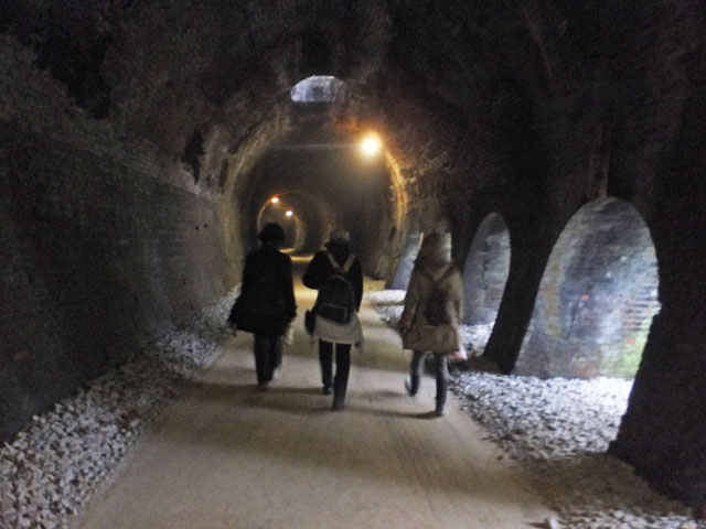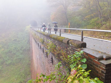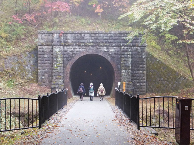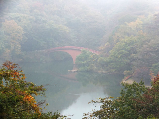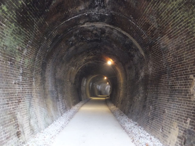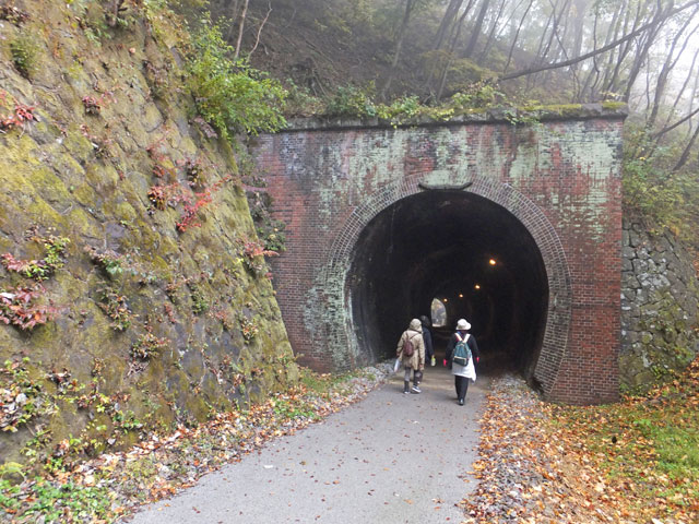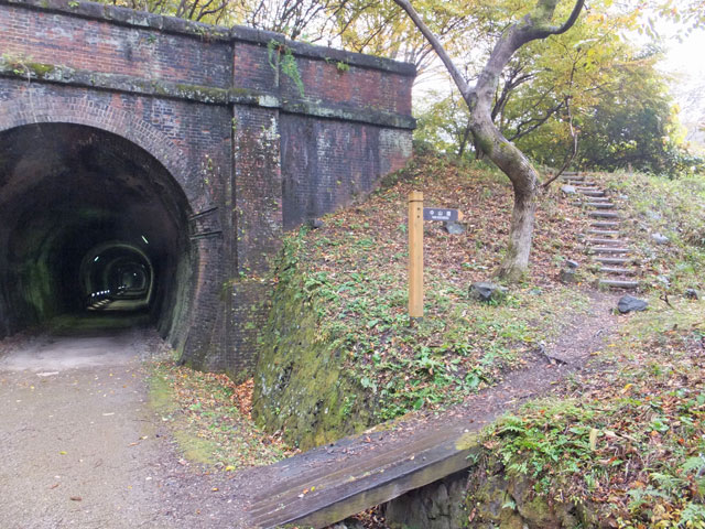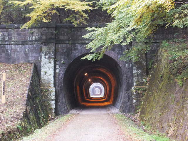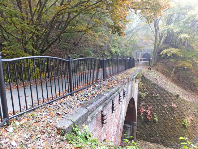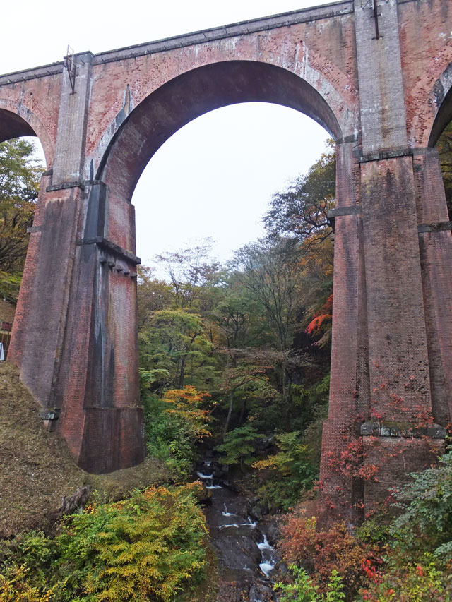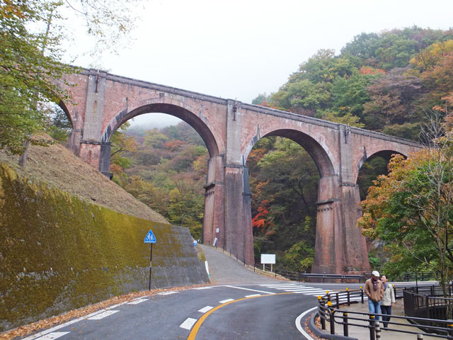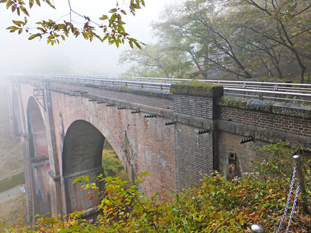 通称「めがね橋」として親しまれている煉瓦アーチ橋で径間(アーチ)数4、長さ 91 m、高さ 31 m でわが国最大規模の煉瓦づくりアーチ橋です。200 万個以上の煉瓦を使い、わずか7ヶ月間で作られました。明治 25 年( 1893 年)に完成し、アプト式鉄道を支えてきましたが、昭和38年( 1963 年)新線開通に伴い廃線となりました。明治 27 年の補強工事で支柱も太くなり、アーチ部分も以前より厚くなりました。平成5年に国の重要文化財に指定され、平成 13 年廃線敷を利用した遊歩道「アプトの道」として整備され、現在は橋上を歩くことができます。