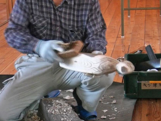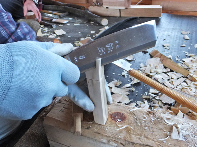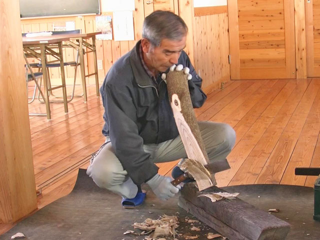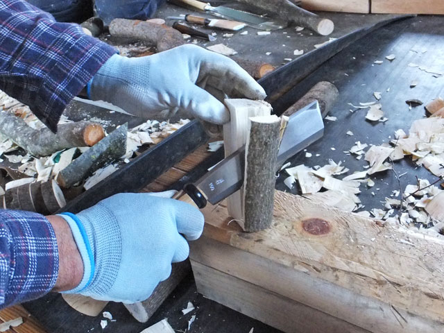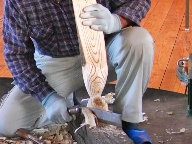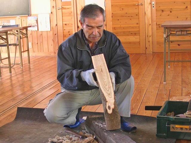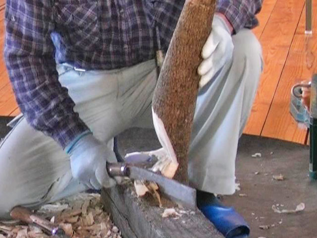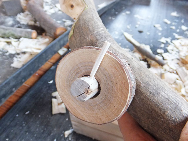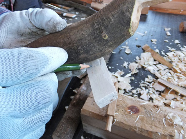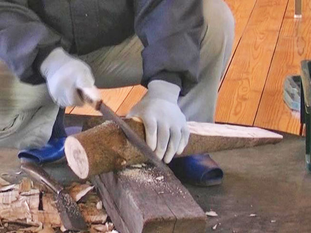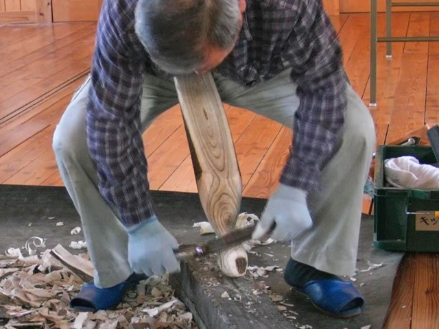 曲がったヌルデの木を使って作ります。ヌルデを使うのは、軟らかく加工しやすいことと、木目が鳥の羽のようになって美しいからだと思います。