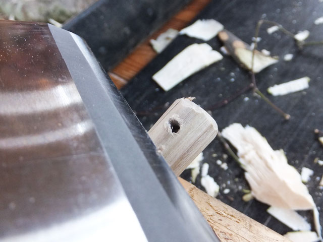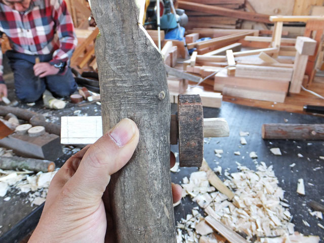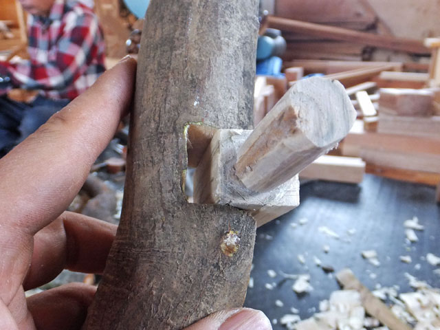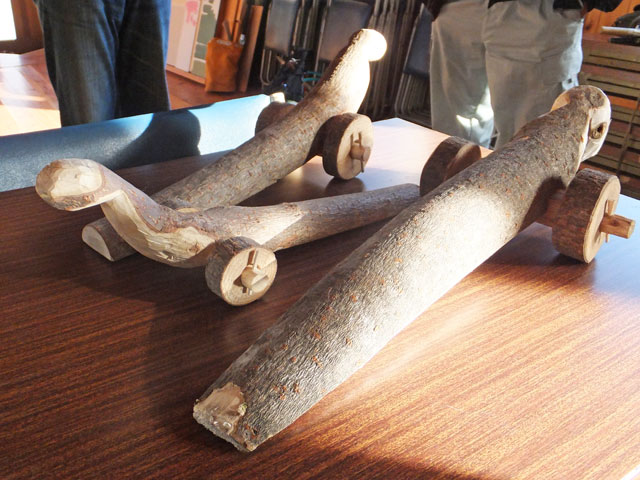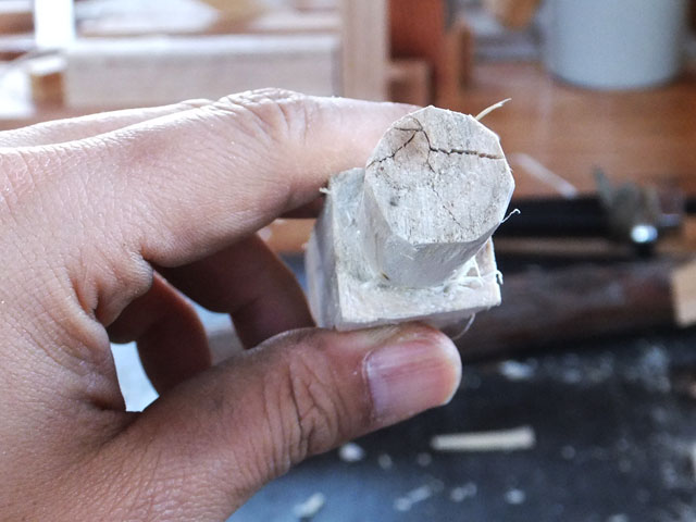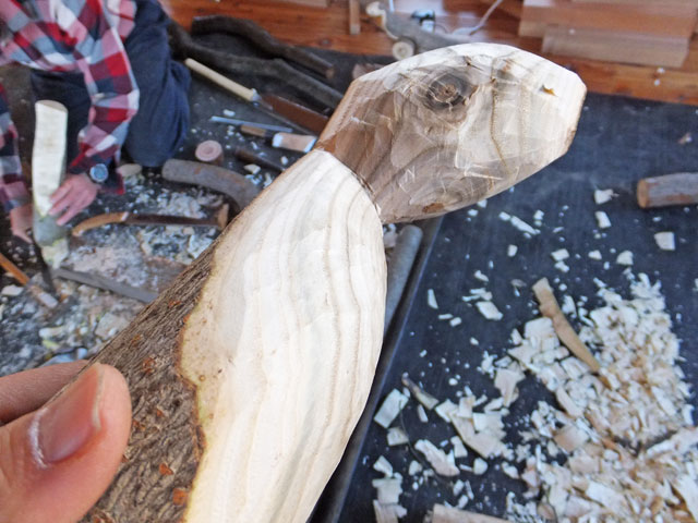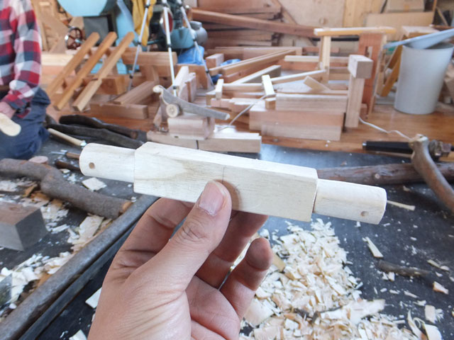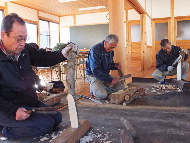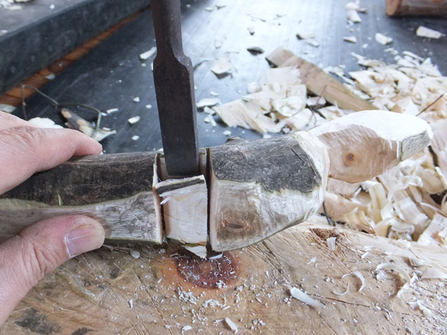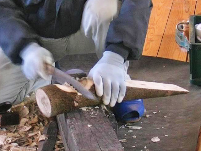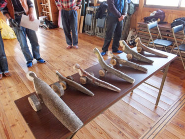 曲がったヌルデの木を使って作ります。ヌルデを使うのは、軟らかく加工しやすいことと、木目が鳥の羽のようになって美しいからだと思います。