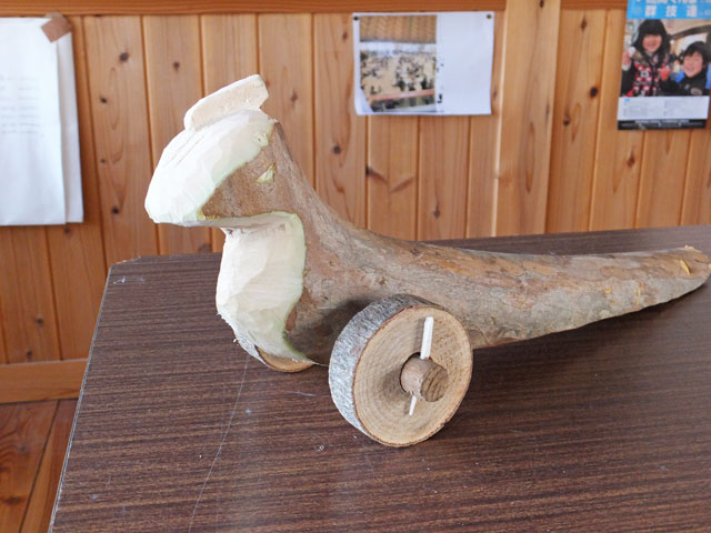 長野原町の佐藤甲子さんにご指導いただきました。小正月のツクリモノの中で、長野原町と東吾妻町にはキジ車をつくる習慣があったらしく、今現在でも作っていらっしゃる、数えるほどしかいない方のお一人です。
