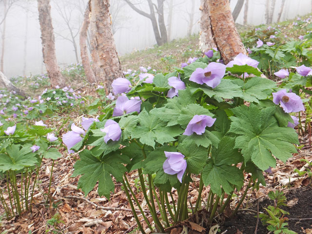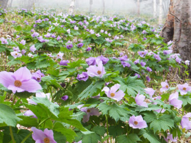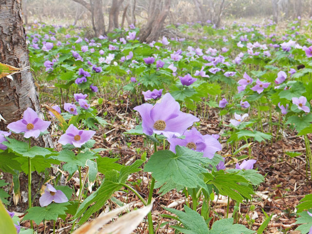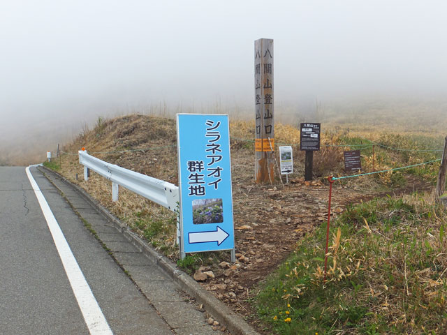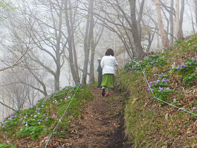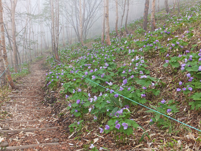 シラネアオイ群生地は、野反湖富士見峠休憩舎道路向かいの八間山登山口から少し登り、左に入ったところにあります。すぐ近くです。シラネアオイを観に来るだけなら、登山靴は必要ありません。歩道の上も下も一面がシラネアオイです。