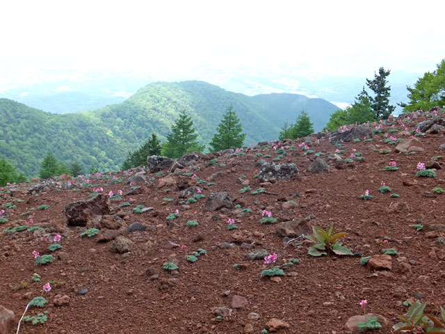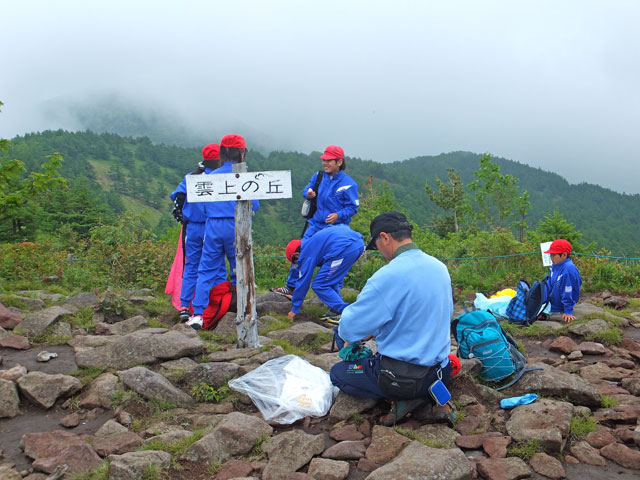 見晴岳西肩で火山の学習。この学校の生徒さんは本当にインストラクターの話をよく聞いてくれます。感心しました。真っ赤に焼けた火砕物が広がるこの場所で、記念写真です。足元は火星のよう、バックには山が広がる…ような写真が撮れるかな?