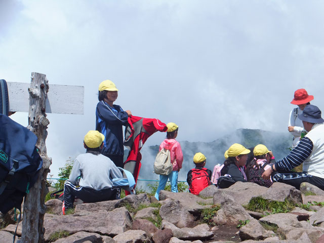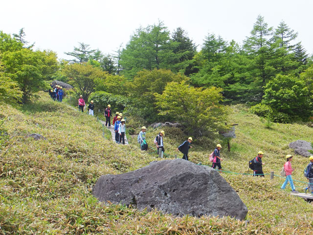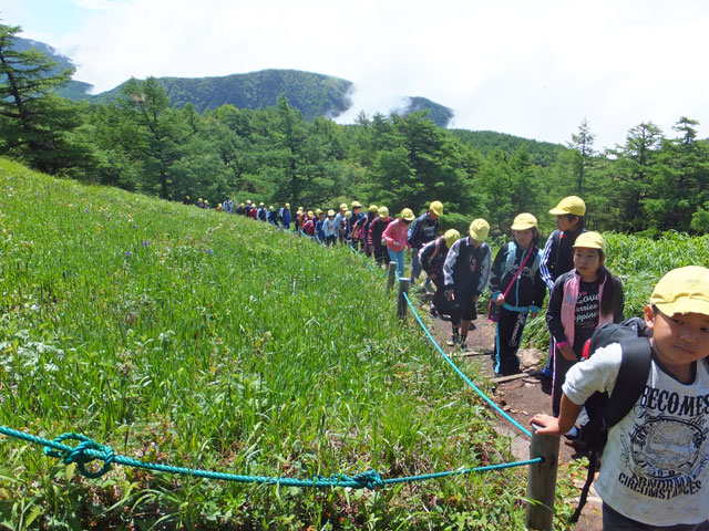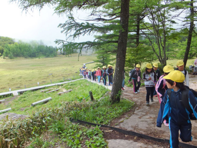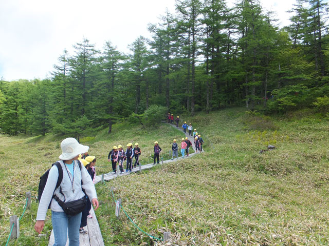 本日は埼玉県K市のI小学校5年生、林間学校の皆様を池の平で自然学習ガイドさせていただきました。約2時間の行程を経て、お昼ごはんです。雨が降る前にここまでこられて良かったですね。来年はここから湯の丸地蔵峠まで歩いて降りましょうね!
