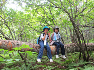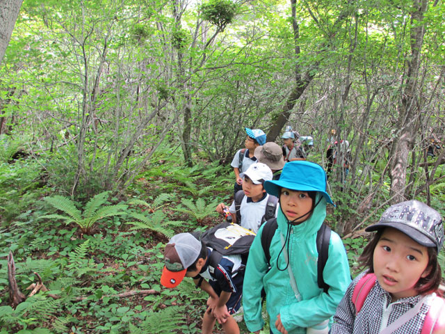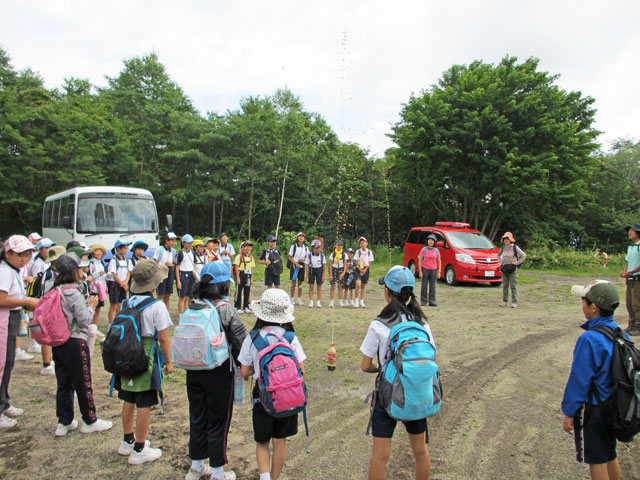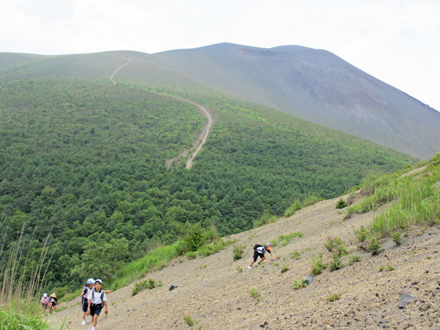 朝一は小浅間山登山を実施。まずは東京大学地震研究所浅間山観測所を訪れます。ここでコーラを使った噴火の実験を行い、噴火の仕組みや軽石のでき方を学んだ後、1783年浅間山噴火の際の降下堆積物を観察し、森の中へ。子どもたちの目がワクワクキラキラしてきました。そういうプロセスを経て、小浅間山に登りました。