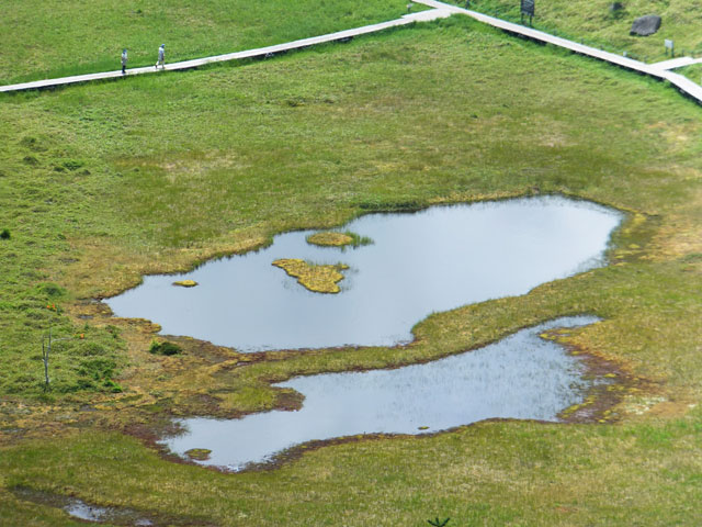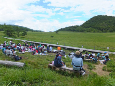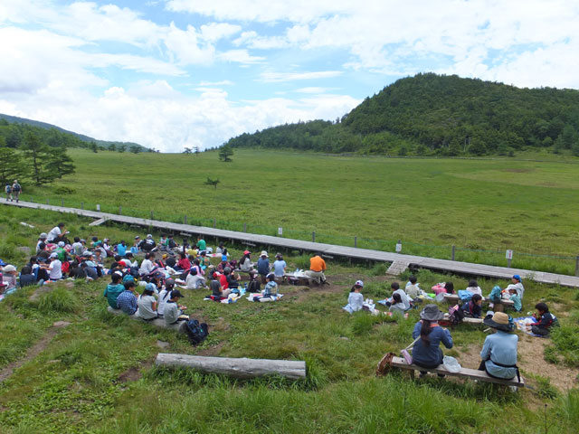 68人にもなると、さすがに木道の途中で「ヤッホー」遊びはできませんでした。最後の、グリーン広場で鉢巻山の岸壁に向かって叫んでみると、「ヤッホッ」って叫んでからちょうど1秒位してから「ヤッホッ」って帰ってくるんです。やまびこの実験、音が進むスピードの学習にもなりましたね!