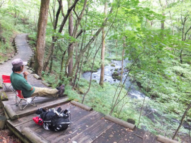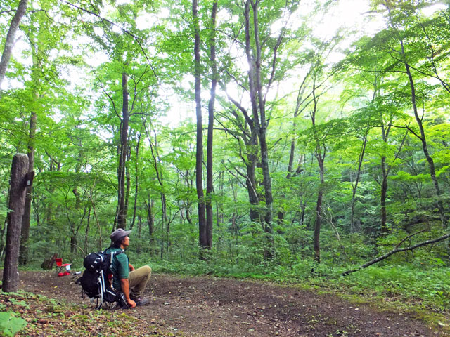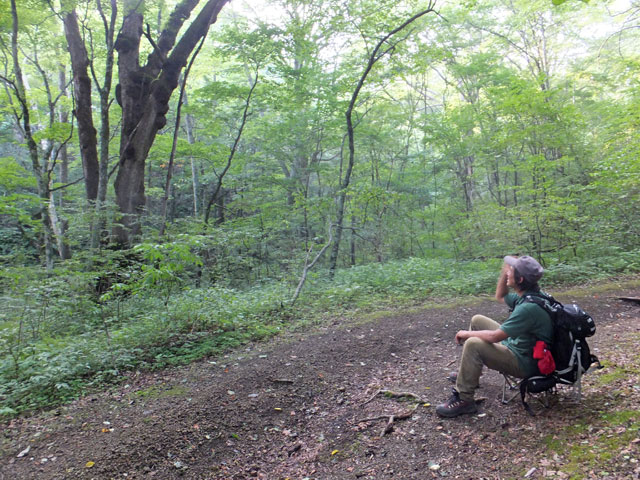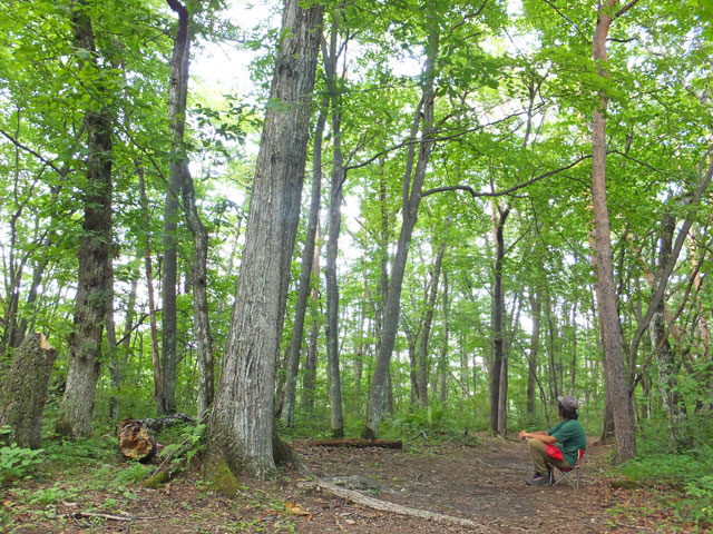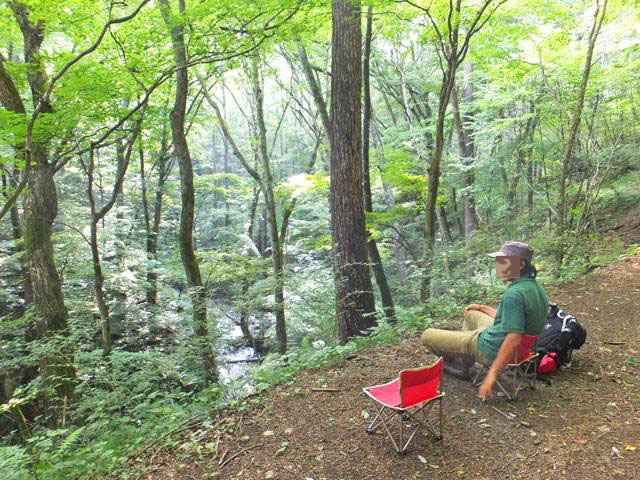 今日はいろんな場所で座ってみる…ということをやってみます。森林セラピーでは「座観」と言って、散策プログラム中に座るなどの楽な姿勢でゆっくりすることで、森林の揺らぎと一体化してみたり、自然のプラーナを感じてみたり、自分の本来の気持ちや体調に気づいてみたりするのです。どこで実施するのが良いのかテストをしました。