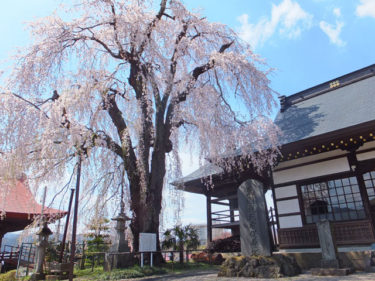 目通り約 3.8 m、樹高約16。林昌寺のしだれ桜は、境内の観音堂と鐘楼の間にある古木です。年々見事な花を咲かせ、観光名所になっています。本堂・庫裡(くり)の大伽藍と、山門( 1736 年〜 1741 年建立)・鐘楼( 1684 年建立)が満開のしだれ桜によく調和しています。