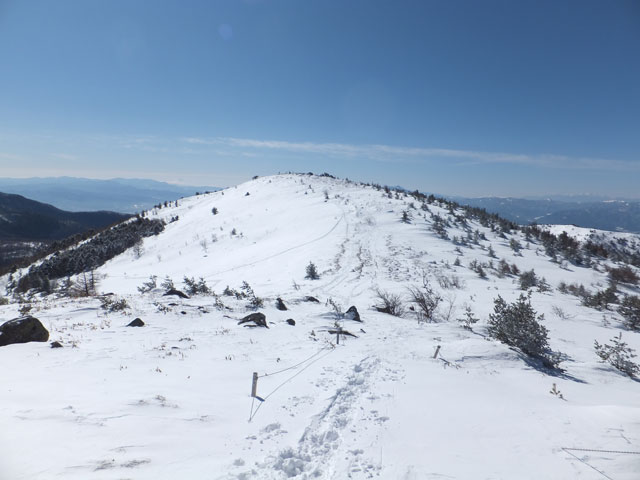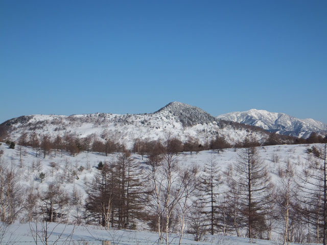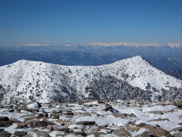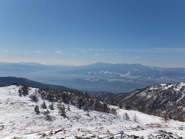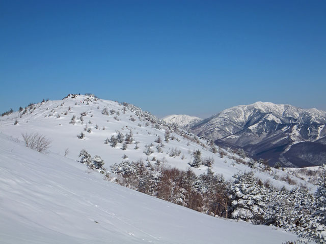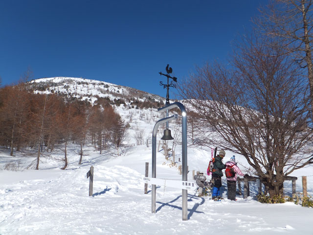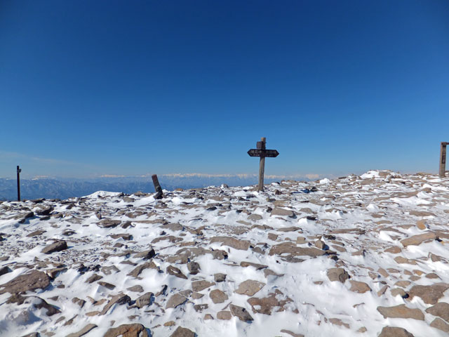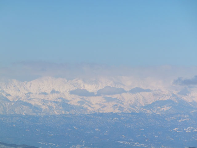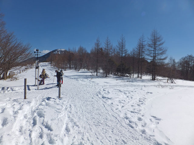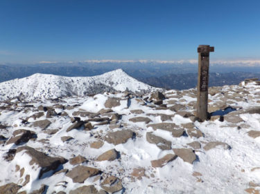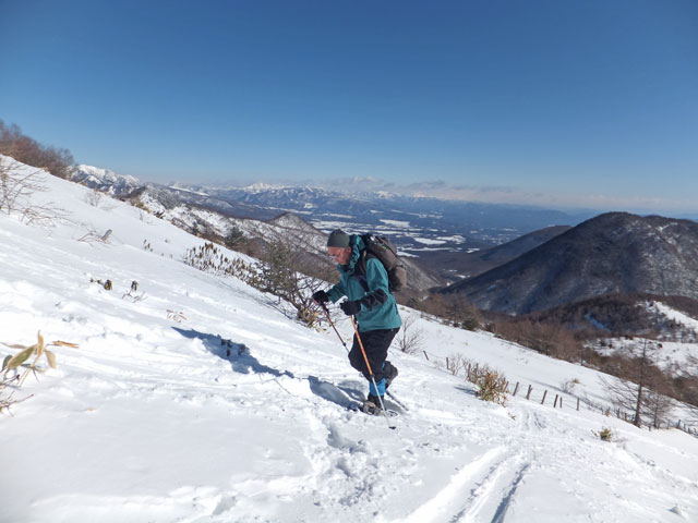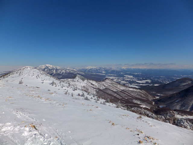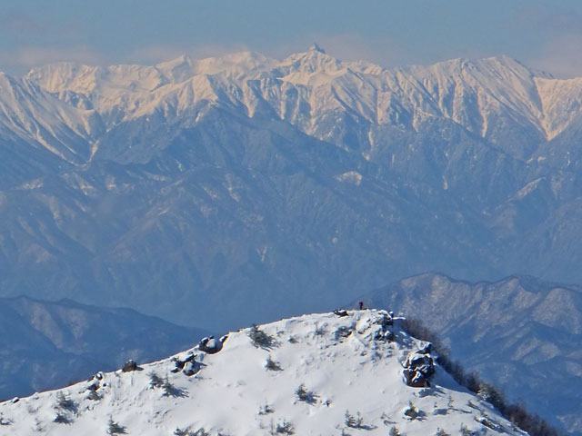晴れた日の湯の丸山スノーシュー。烏帽子岳山頂に人がいて、槍ヶ岳・穂高連峰が良く見えました。