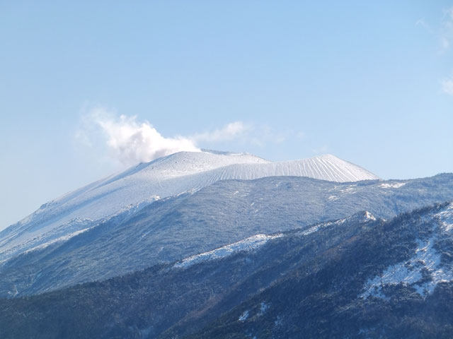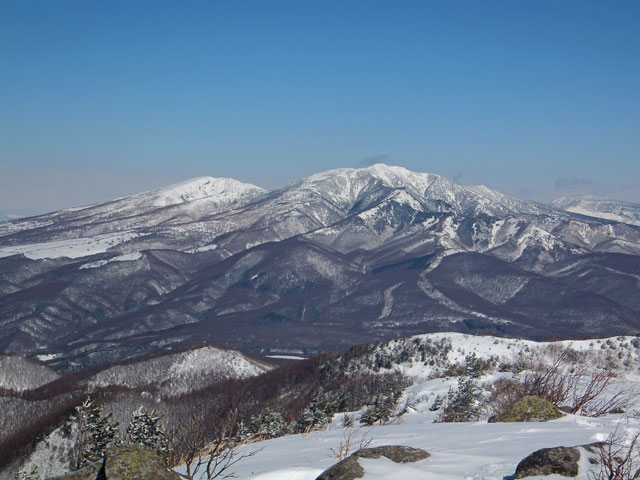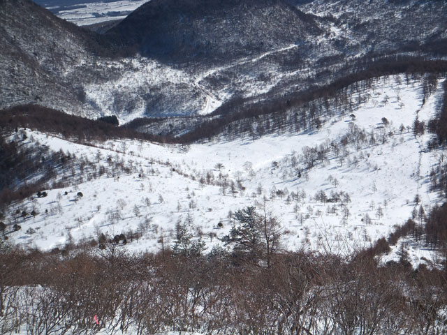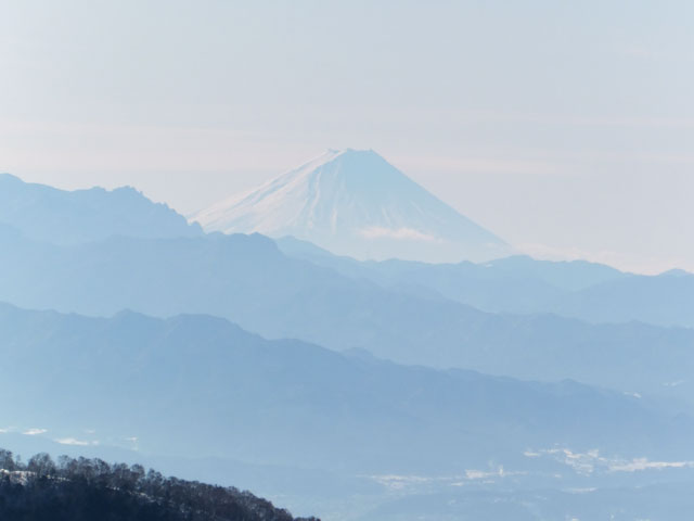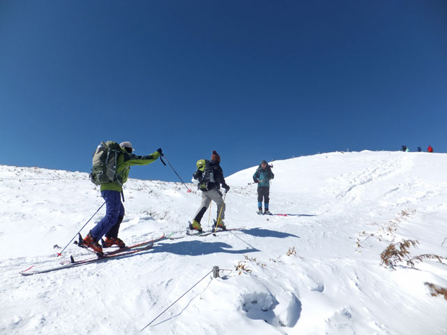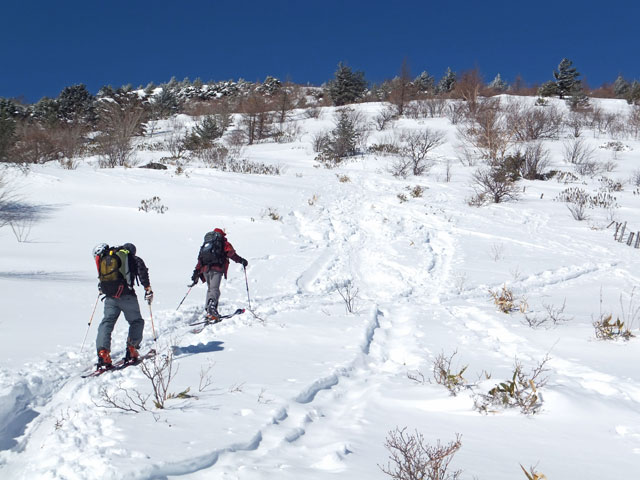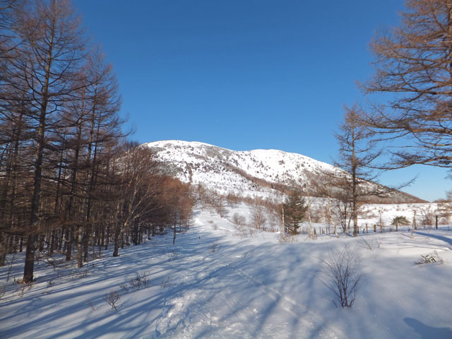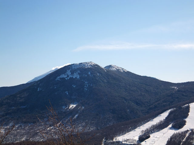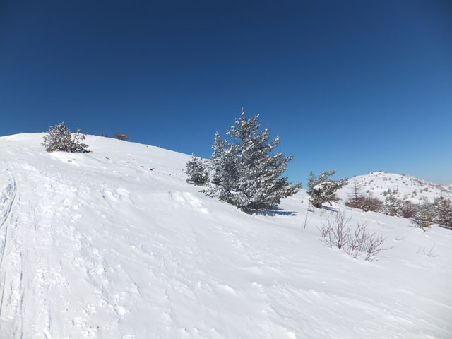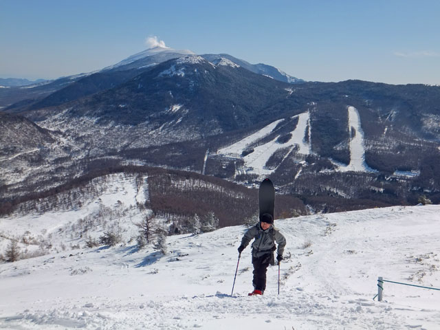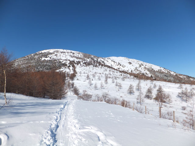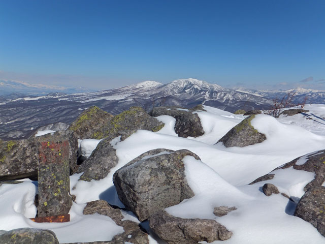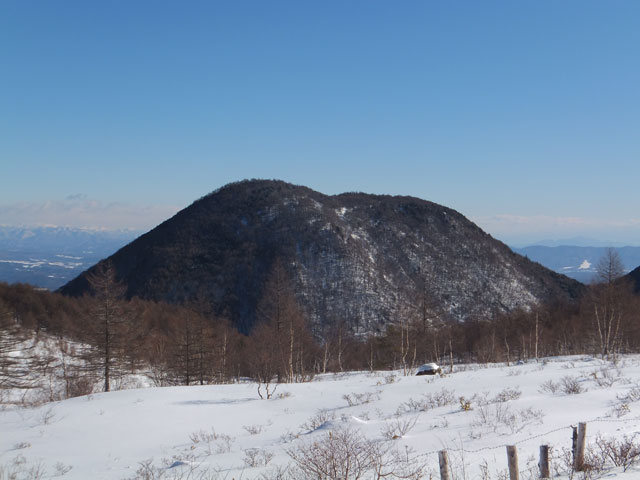 晴れた日の湯の丸山スノーシュー。烏帽子岳山頂に人がいて、槍ヶ岳・穂高連峰が良く見えました。