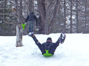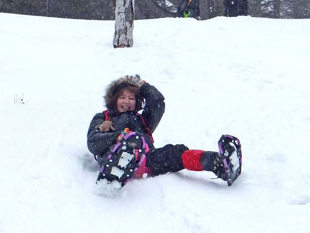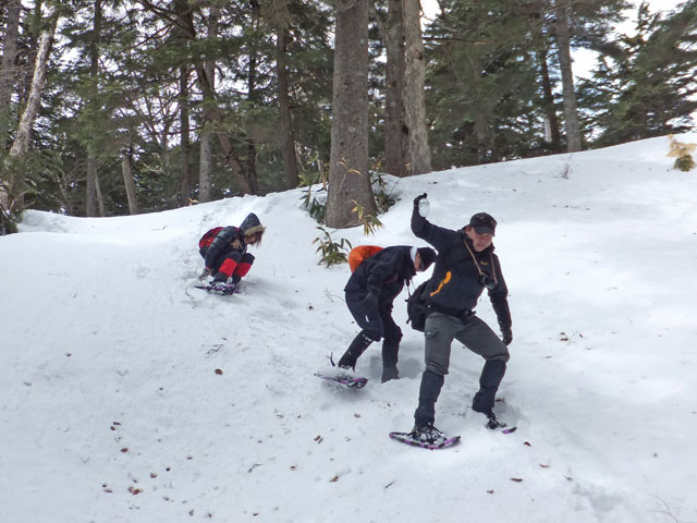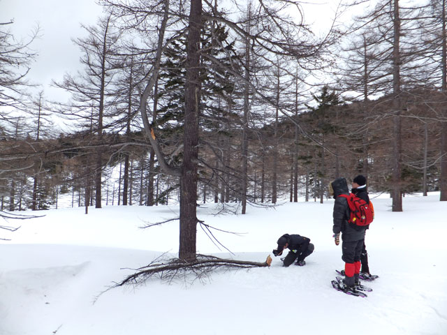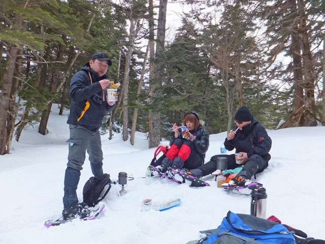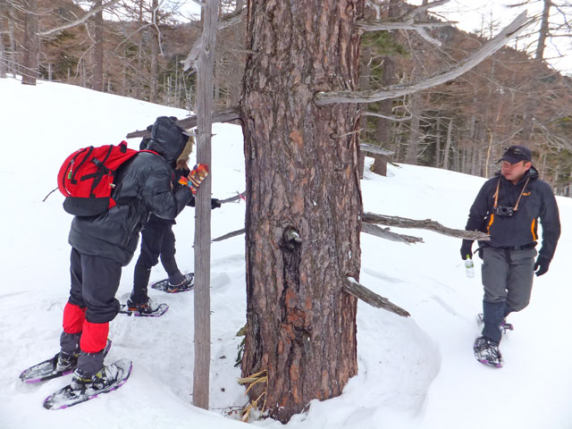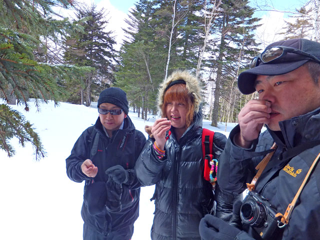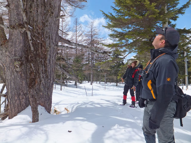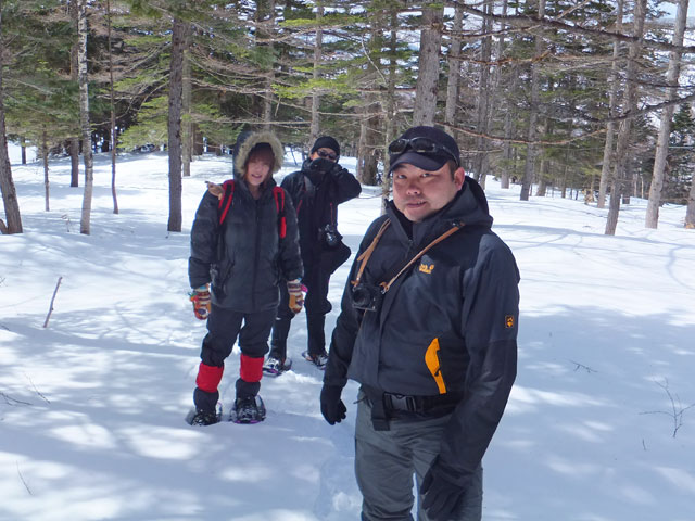 今日の万座温泉スノーシューエコツアーは3名様。かつての同僚だったKさんがご友人を連れて申し込んでくださいました。Kさんは今後サバイバルスクール的な活動をなさっていくそうで、スノーシューツアーとはどういうものかを体験しに見えました。