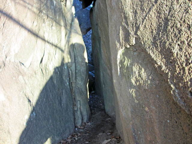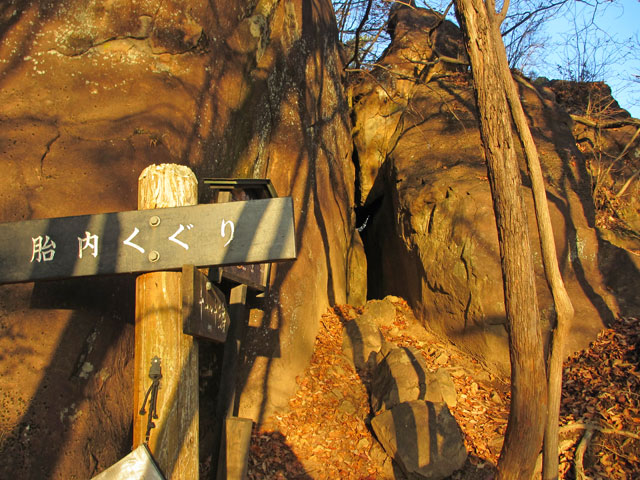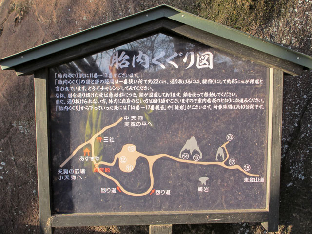 「胎内くぐり」の岩と岩の隙間は一番狭い所で約 22 cm、通り抜けるには、腰回りにして 85 cm が限度と言われています。どうぞチャレンジしてください。