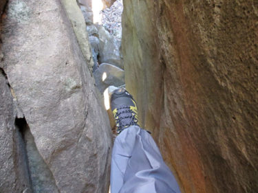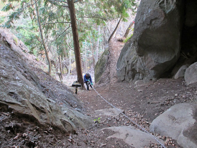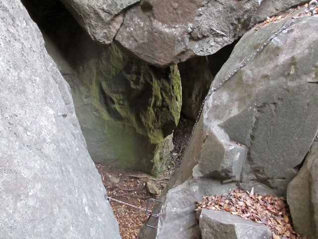 なお、岩を通り抜けた先は急傾斜につき、鎖が設置してあります。鎖を使って移動してください。