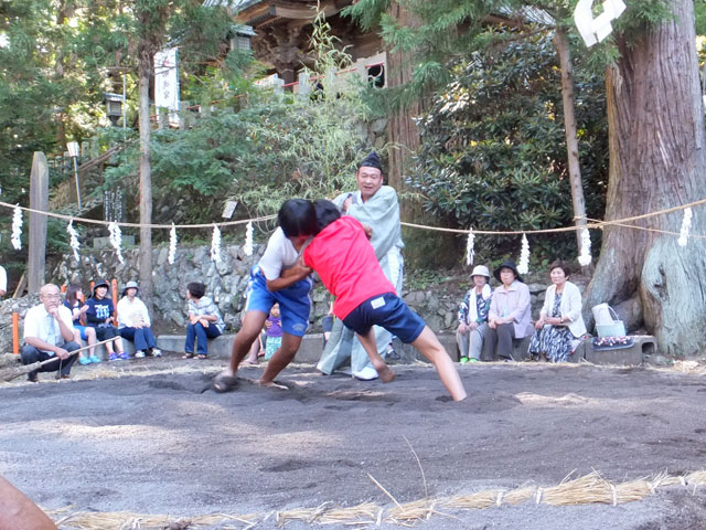 七月廿七日廣庭において団子相撲という例祭あり、団子相撲と云ハ米の粉にて人形を作り、参詣の砌小児に投させ、斯の如く勇力に成長する処を守らせ、いへいへ心願してして吉端をねがう祭礼なり、何の地よりか男子相撲と唱へ十才以下の子どもに相撲をとらす。是も寿命長久の祭礼なり、斯の如く利益莫大なる御神なれハ、常に信仰する輩は子孫永盛・剱難矢除守護疑なしと云