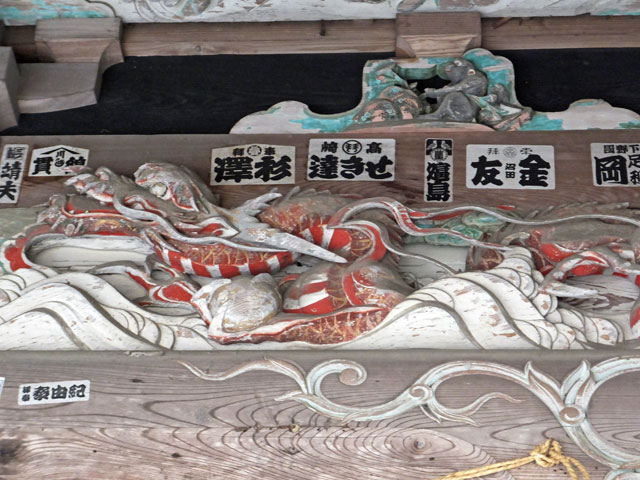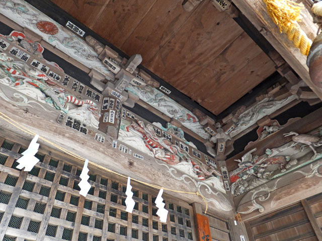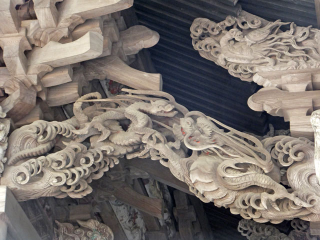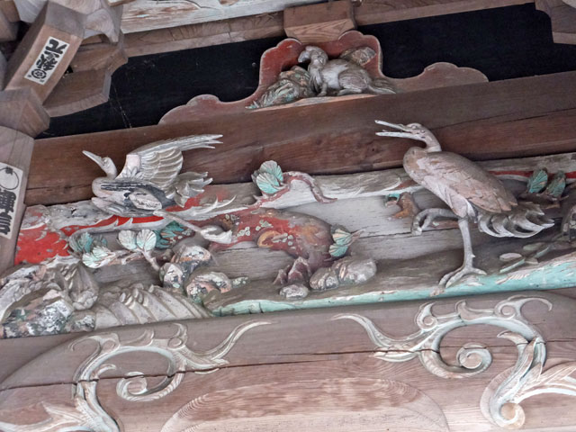 しかしここの彫刻は年季が入っている上に、見事です。木鼻は獅子と、花? 拝殿入口にもびっしり。鶴は今にも羽ばたきそうです。龍もいい感じ。