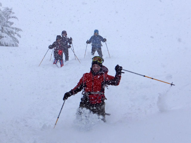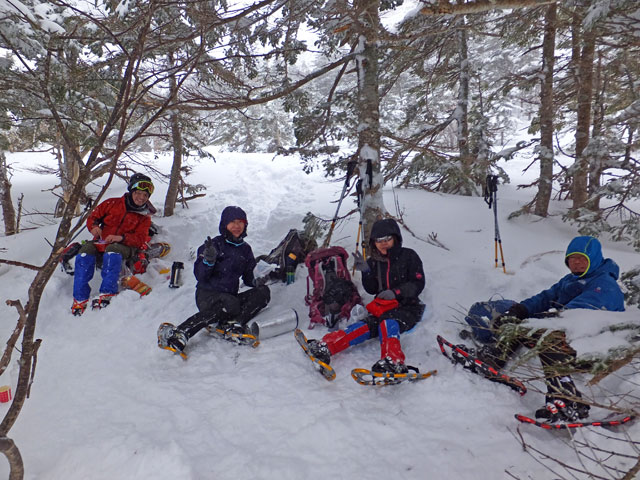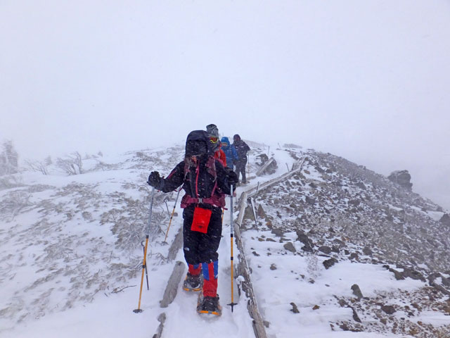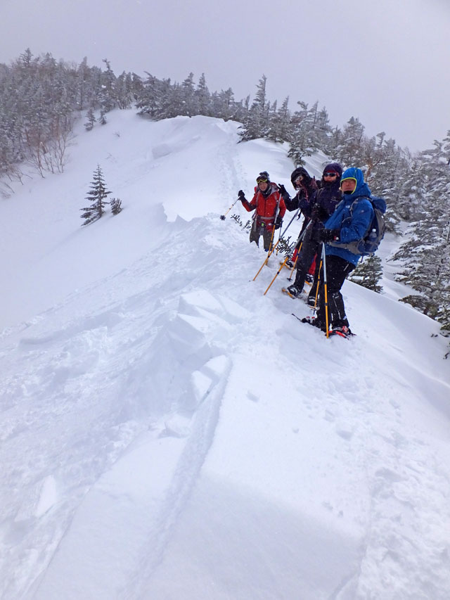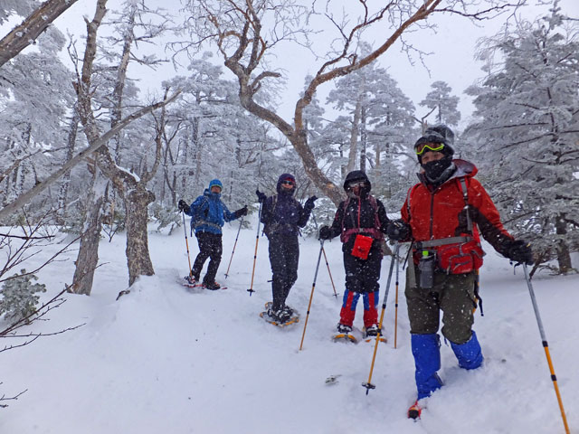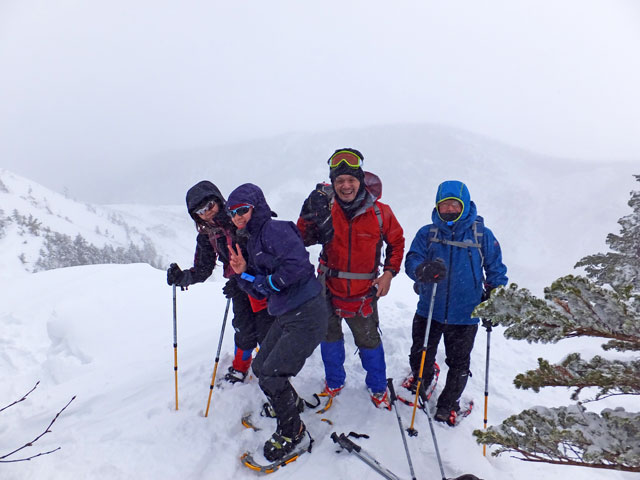 本白根山頂に到着。赤い上着の男性I様は、スノーシューではなく12本爪アイゼンで挑戦です。こんな雪深い状況で、大丈夫ですか?!