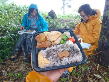 桟敷山での森林浴セラピー登山、雨に降られて残念でした。Sさんが作ったビーガン弁当を食する体験会でもありました。