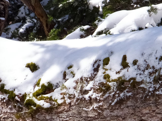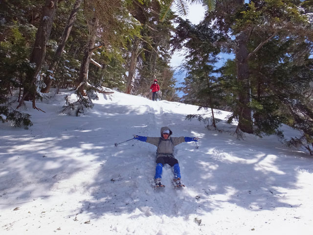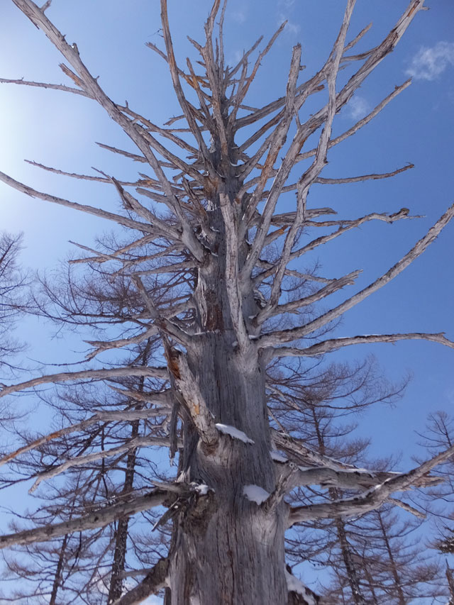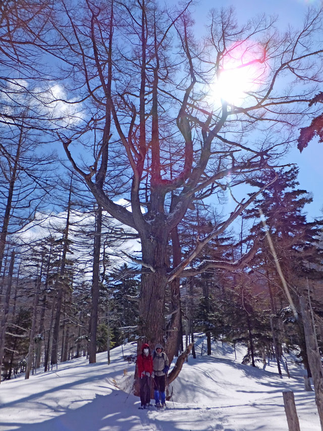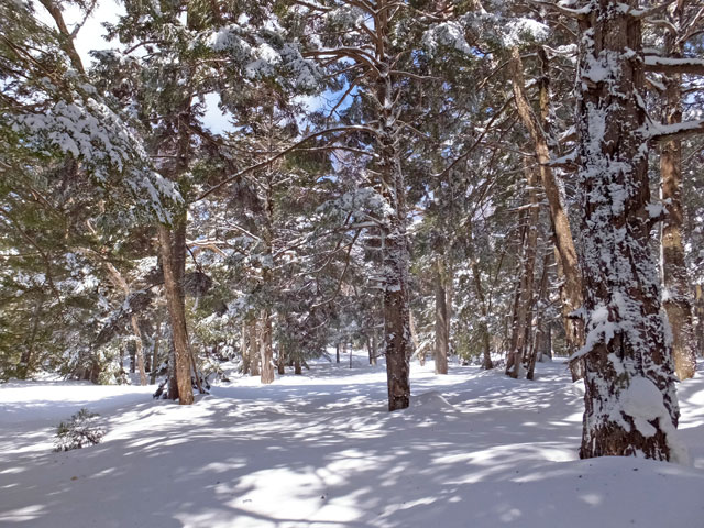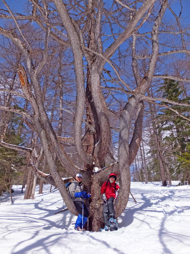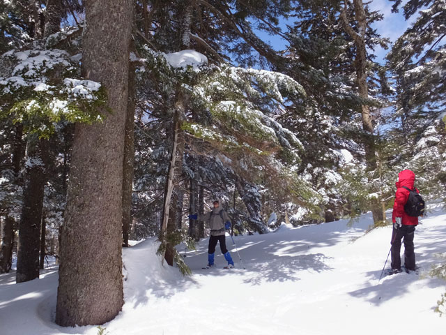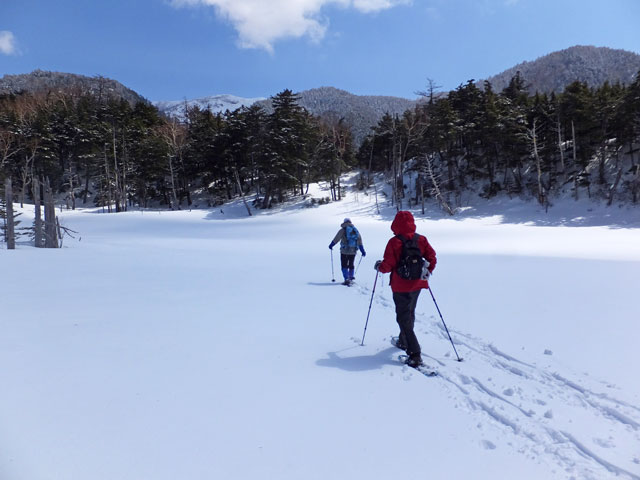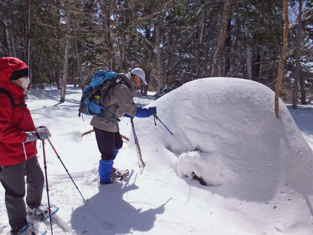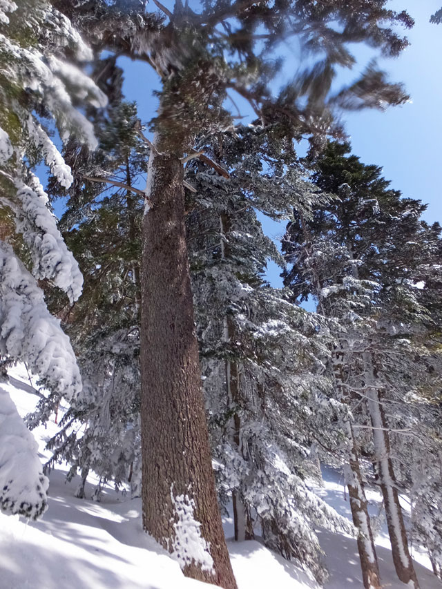 万座温泉弁天池、針葉樹巨木の森スノーシュー
