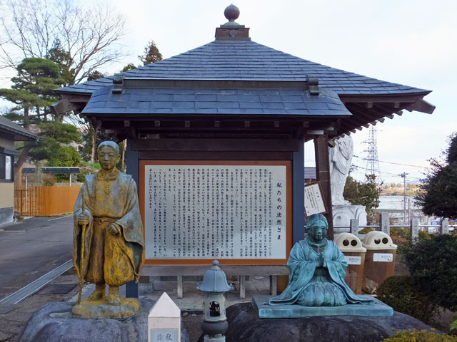 清見寺再興四百周年記念建立の看板等によると、浄土宗長岡山清見寺は、長禄2年(1458年)に開創されたそうで、京都知恩寺から来た岌山和尚(きゅうざんおしょう)が慶長元年(1596年)に再興以来、平成8年(1996年)には四百周年を迎えたとのこと。先人の遺徳をたたえ、恒久平和・交通安全・諸願成就等を祈願し、身丈十八尺(5.6m)の大聖観世音菩薩像が建立したとのことです。