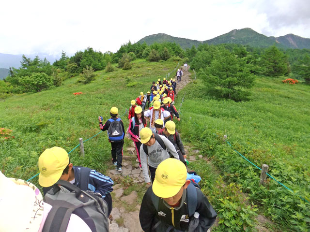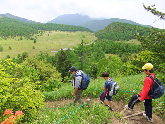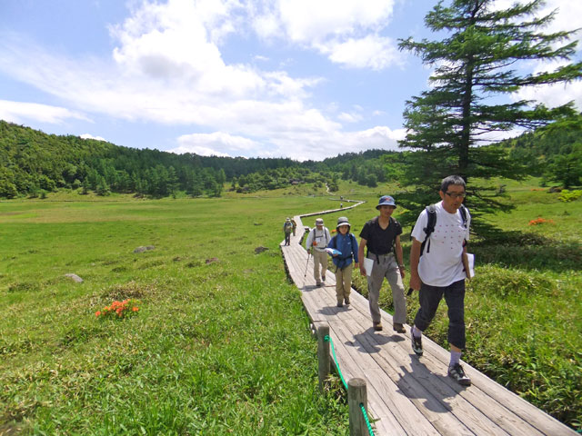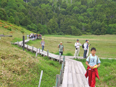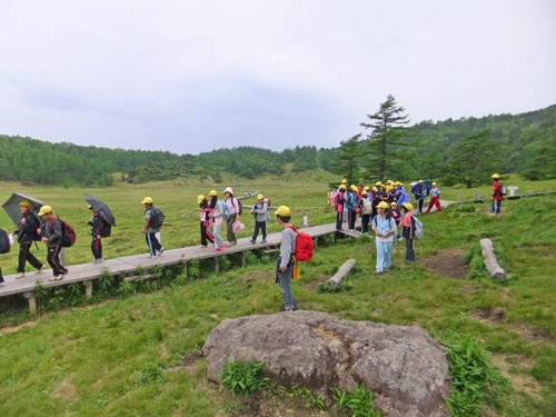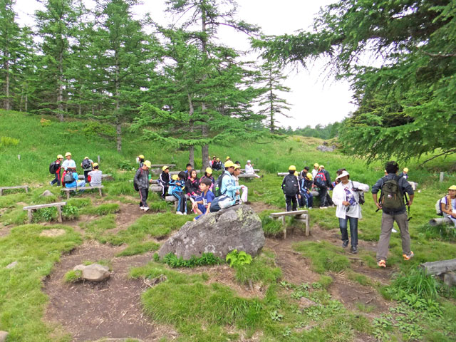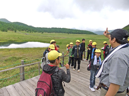 池の平は、林間学校などの教育旅行団体様には人気の場所です。生物の共生進化、旧火山火口からの植生遷移の様子などをレクチャーします。大人の方にはフラワーウオッチングハイキングをご提供します。