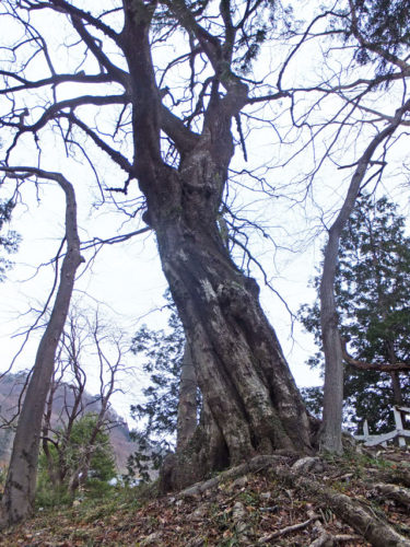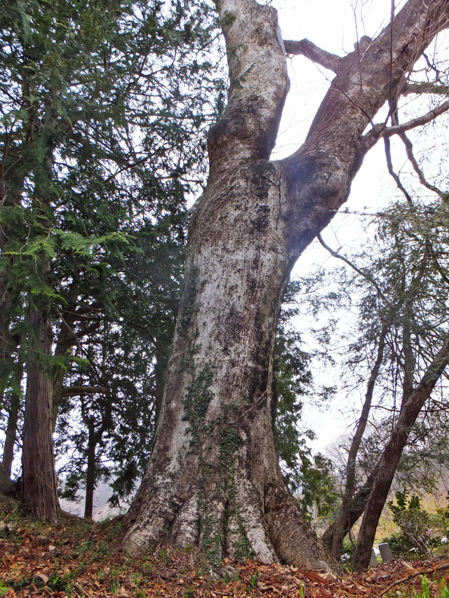 御塚霊園境内のイタヤカエデは長野原町指定天然記念物(昭和 53 年(1978年)2月 28 日指定)で、胸高周 3.70 m、樹高 32 m、根元周 5.30 m、樹齢推定300年だそうです。26 年経った現在測ってみたところ、3.74 mです。25 年間で直径3cmは、今朝の大杉とはずいぶん違った値ですね。
