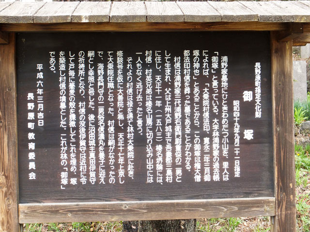 浦野家墓地にひときわめだつ小山を、里人は「御塚」と言っている。大字林浦野家の過去帳によれば、「大乗院村信法印、寛永二年三月御塚の神也」とあることから、この御塚は権大僧都法印村信を葬った墓であることがわかる。