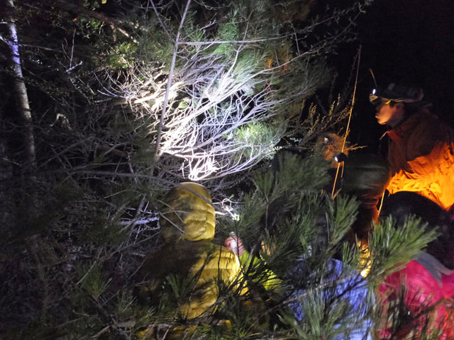 19:00、夜の自然探索スタートです。始まってから間もなく、シラカバの木に空いた穴を観察するとアカゲラが!皆さん、超ラッキーでしたね!でも、アカゲラにとってはかわいそう。皆さん見ましたね、じゃあ、静かに退散しましょう…