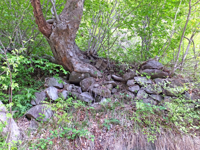 ところが、石積みに根が絡まったように見える大木までありました。樹齢は100年位でしょうか。石積みの上には30〜50年位の中径木もあります。
