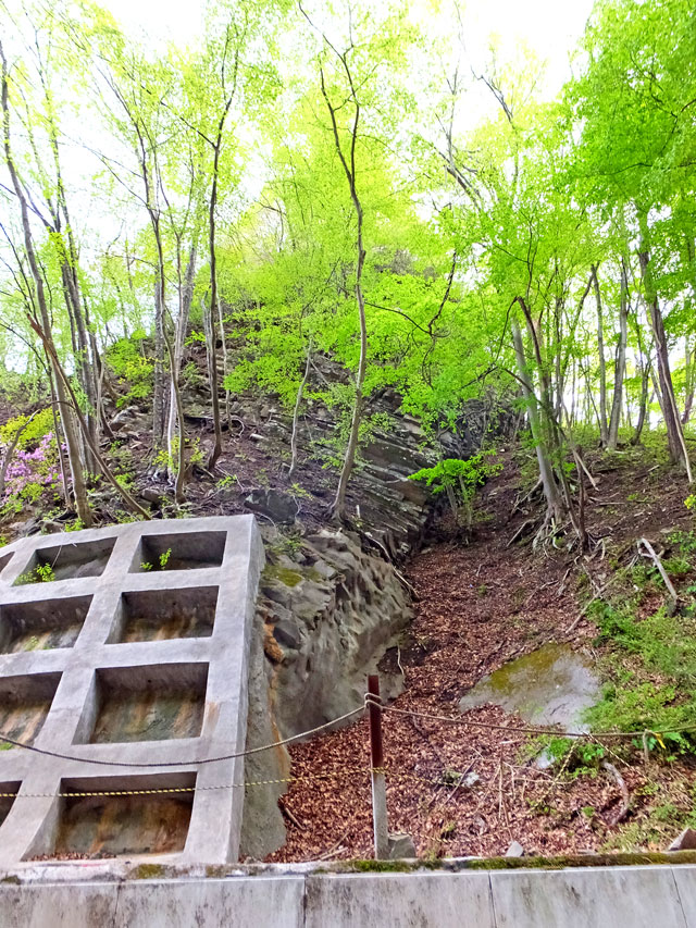 驚いたことに、久森トンネルは上まで伸びている臥龍岩をぶち破って造ったトンネルだったのですね。220万年前のマグマの固まり・臥龍岩の欠片、砕いたんなら、私にもくれないかな。