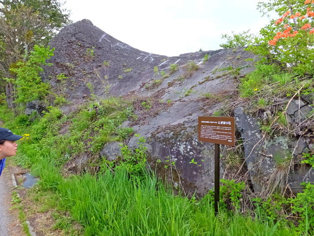 上の斜面に大きな動物の歩いた足あとのように爪の食い込んだあとが点在しています。「天狗の爪あと」などともいいつたえられています。