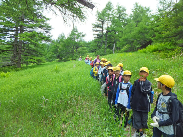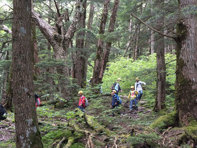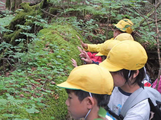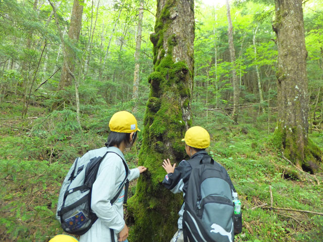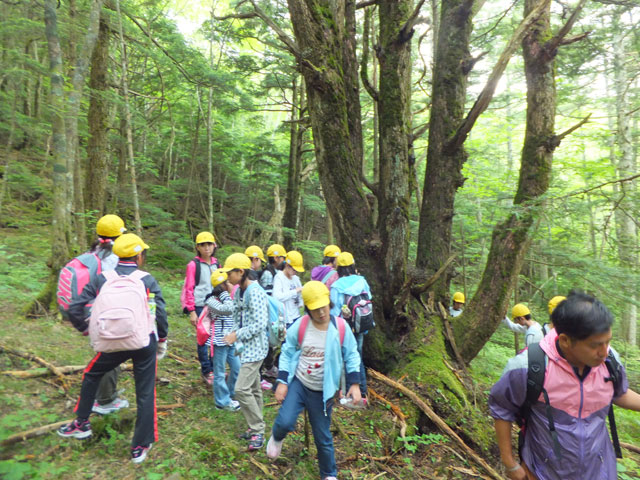 埼玉県北本市H小学校様自然体験学習風景です。池の平の天然林の中を歩くと、幹が7本に分かれた幻想的な巨木があります。不思議な雰囲気に包まれているこの場所は、もしかしたらこのスフィンクスが護っているのかもしれません。