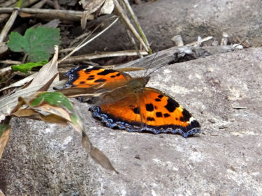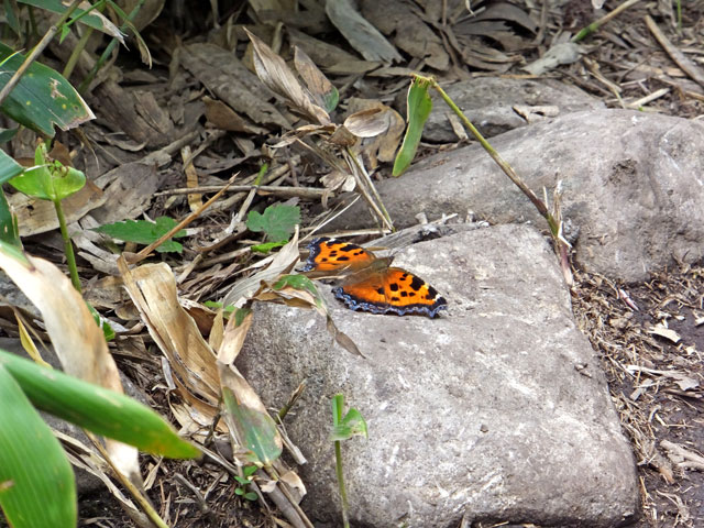 登山道の石上で、日光浴をするヒオドシチョウ。