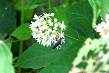 イケマにハナカミキリとセセリチョウが。イケマって、渡り蝶・アサギマダラの食草で、ガガイモ科植物特有の毒性の強いアルカロイドを含んでいるはずです。アサギマダラはこれらのアルカロイドを取りこむことで毒化し、敵から身を守っています。イケマの花の花粉や蜜には、どうなんでしょう。毒はあるのでしょうか?ハナカミキリやセセリチョウは毒化しているのでしょうか。