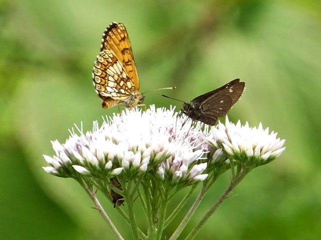 【右写真ヨツバヒヨドリ】左:コヒョウモンモドキ、右:セセリチョウ科の蝶(同定に至らず)