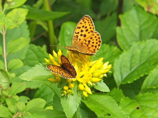 【左写真キリンソウ】左下:コヒョウモンモドキ、右上:ヒョウモンチョウ