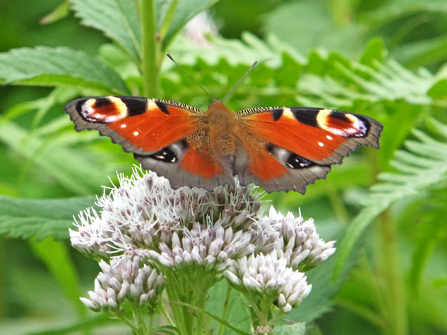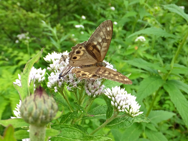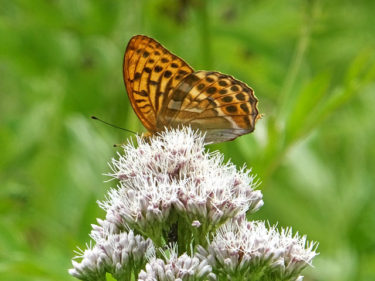 【左写真ヨツバヒヨドリ】:ミドリヒョウモンの♂、前翅下方の翅脈上にある性標4本が目立っています。