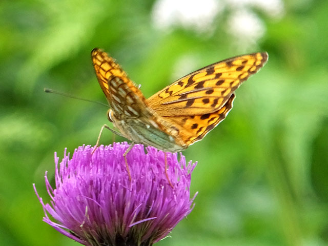 【右写真ノアザミ】:ウラギンヒョウモンの♂、前翅下方の翅脈上にある性標2本が目立っています。