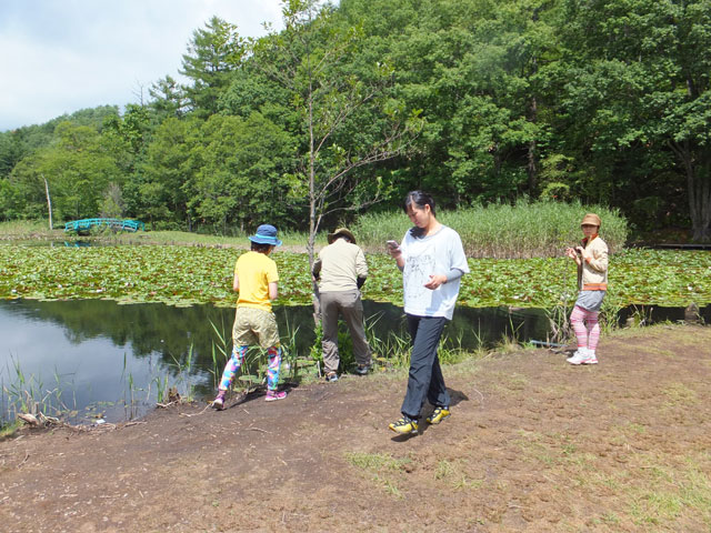 そよ風の広場でゆっくりしました。ボーっとしていると、やがて森のリズムとシンクロしていきます。心身に森の揺らぎが浸み渡って行きます。その後、大谷地にもご案内しました。もうお盆過ぎだというのに、スイレン(睡蓮)の花がまだ咲いていました。