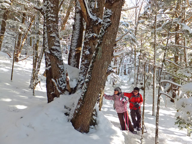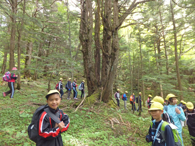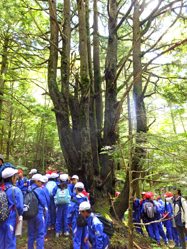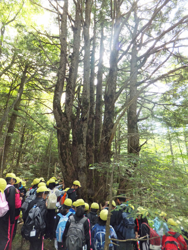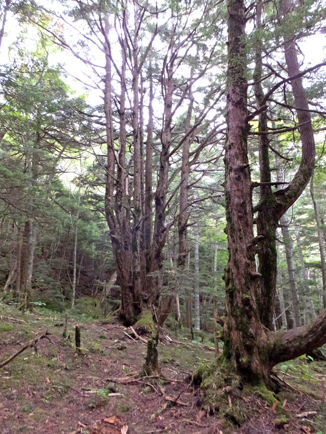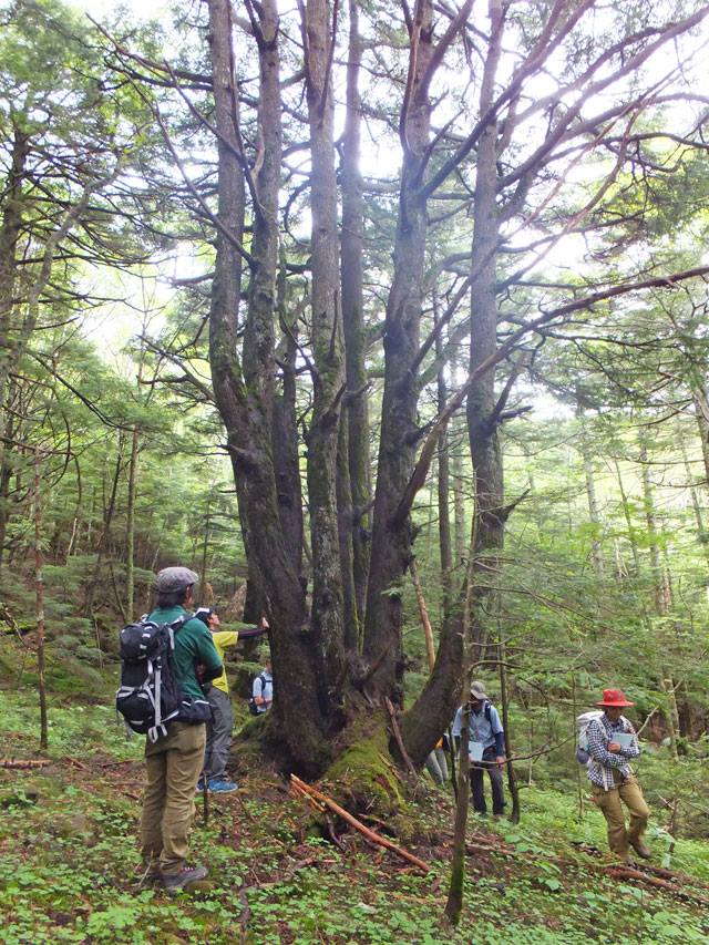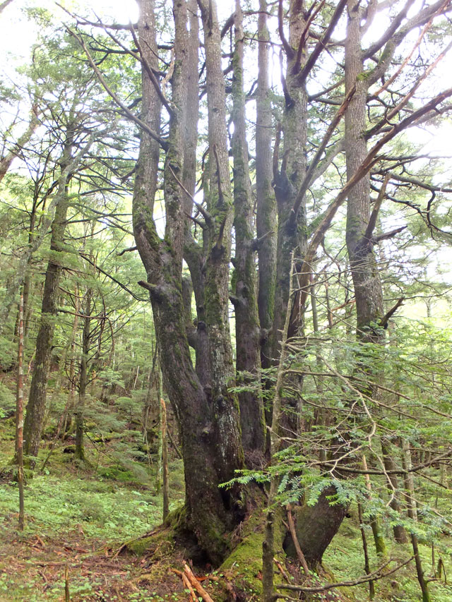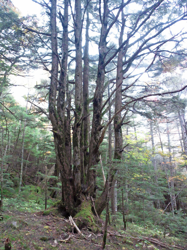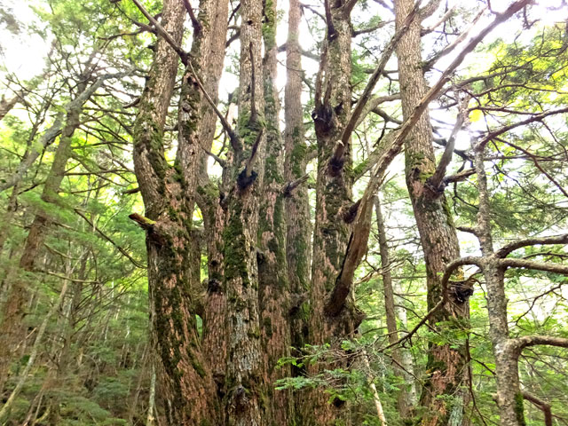 池の平から湯の丸地蔵峠に下りてくる自然歩道沿いにある、七本幹のコメツガ。何かを放っているようにも見えます。この素材でガイドは何を伝えるのか。インタープリターの腕の見せ所です。