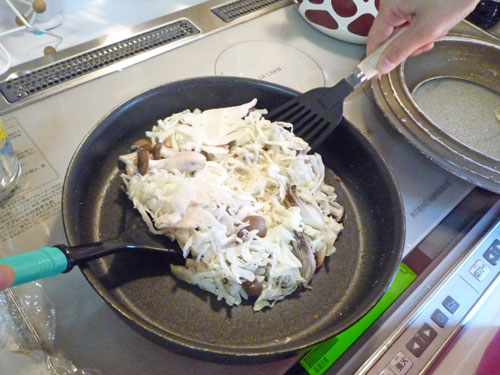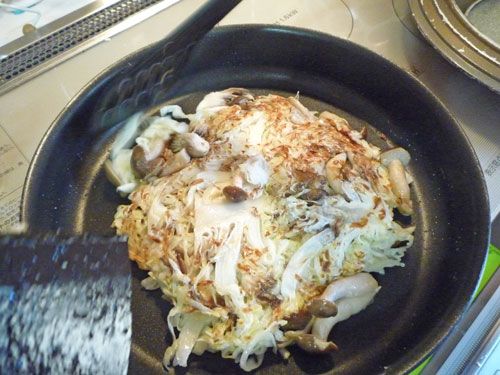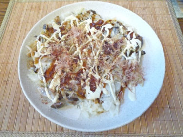 引っくり返したらまんべんなく押し付けて、蓋をしめ弱火で裏面が少しきつね色になるまで焼いて、最後にお好み焼ソース、マヨネーズ、かつお節、青海苔をトッピングしてできあがり。お味の方は…
