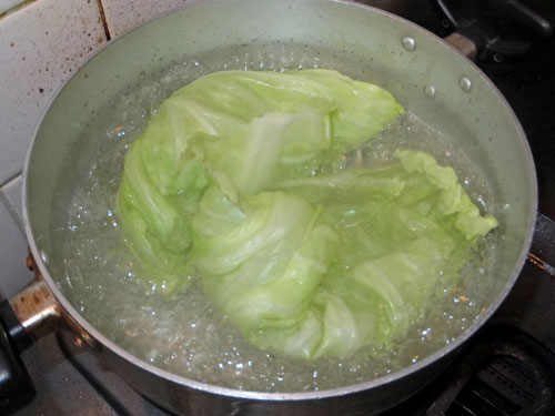 キャベツはLサイズよりもLLサイズ以上がいいでしょう。大きめの葉5枚をさっと湯がきます。もちろん、電子レンジでチンでもかまいません。巻くのに面倒な太い葉脈は切り取ります。