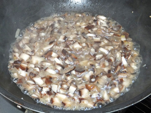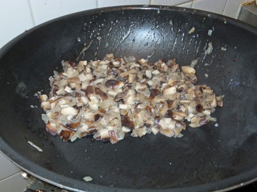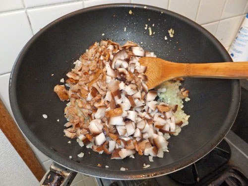 玉ねぎが透明になったら、きのこと塩を加え、炒めます。野生きのこ(ここではナラタケ)を水洗いしていることもあり、大量の水が出てきます。