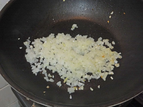 フライパンにオリーブオイルを敷き、みじん切りにした玉ねぎを炒めます。
