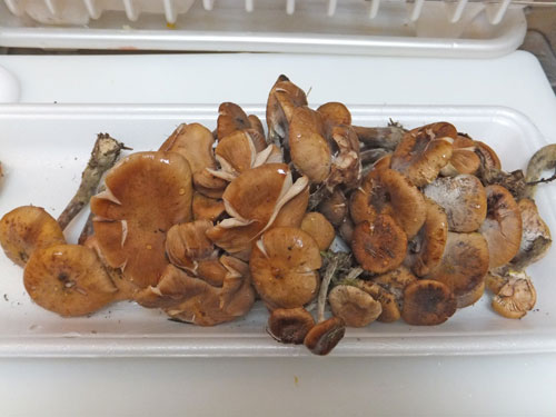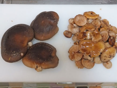 天然もののきのこはゴミも虫も凄いので、しっかりと水で洗います。この時、傷んでいるものはポイポイ捨ててしまうのがお腹を壊さないコツ。ナラタケは傘のみ使います。早人さんのシイタケもとても立派です。